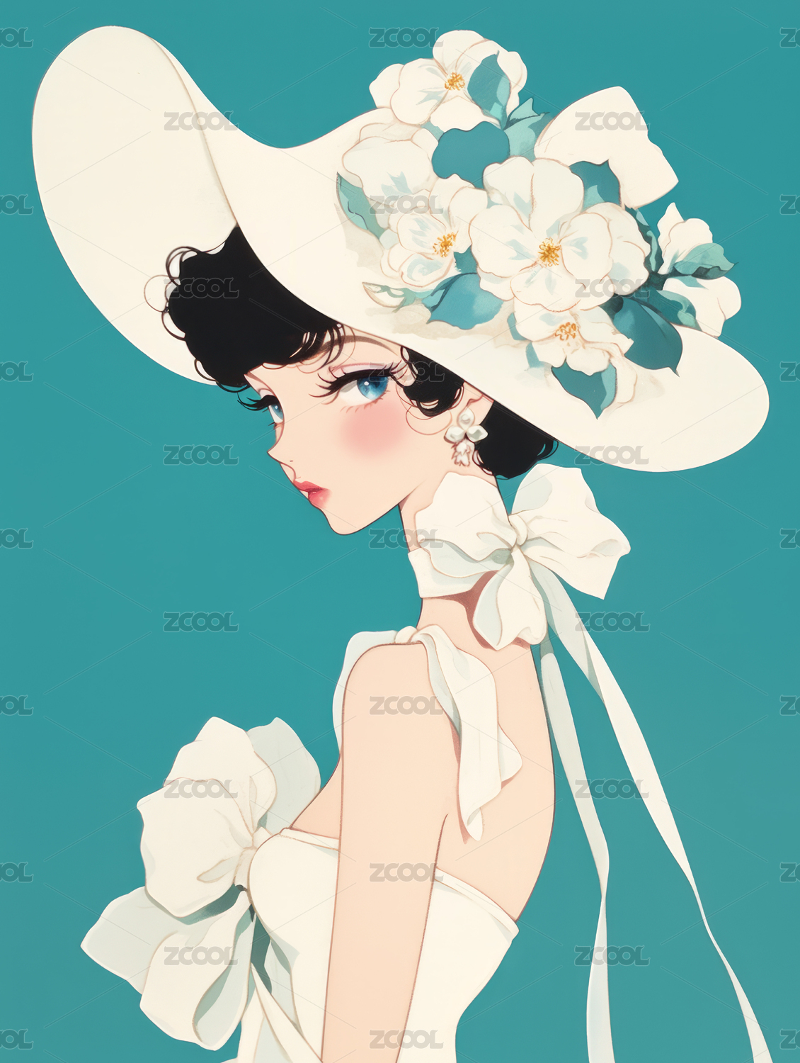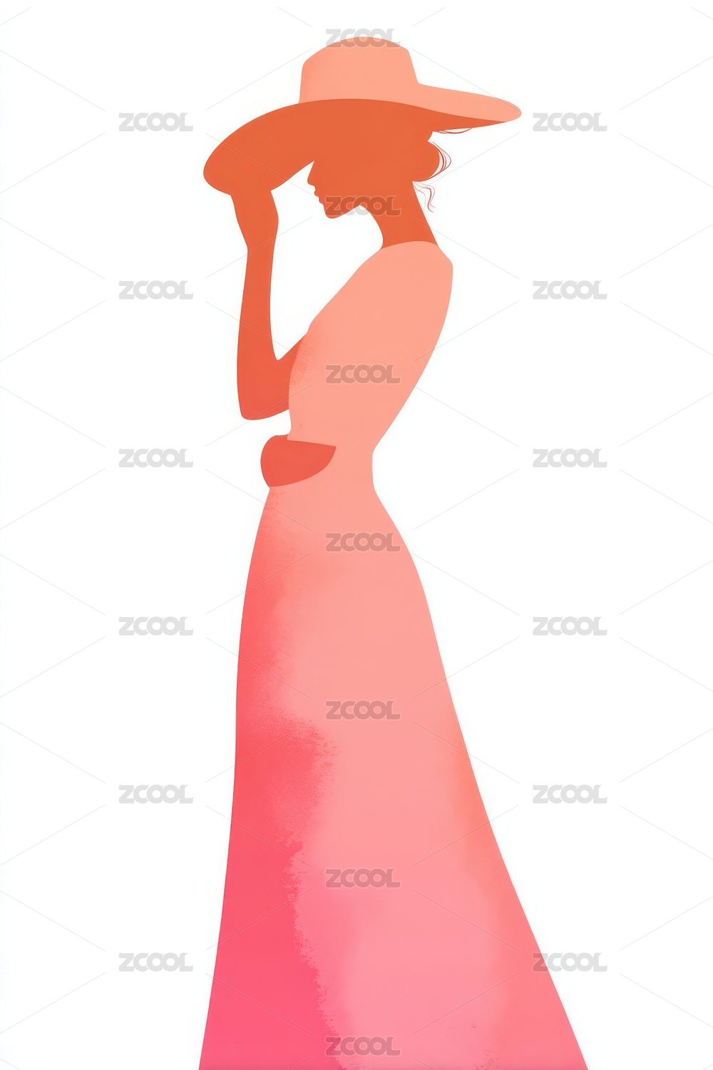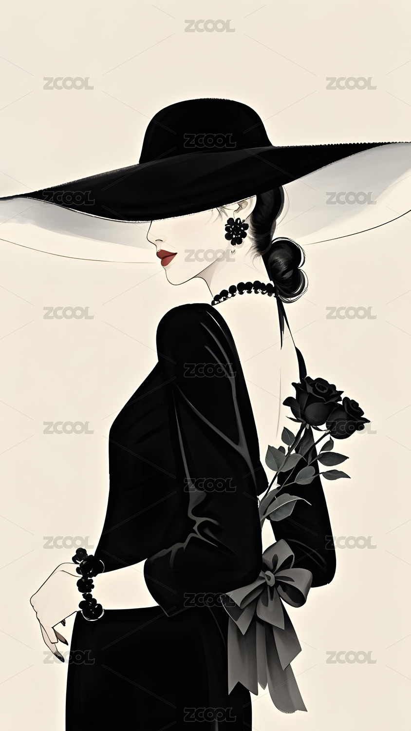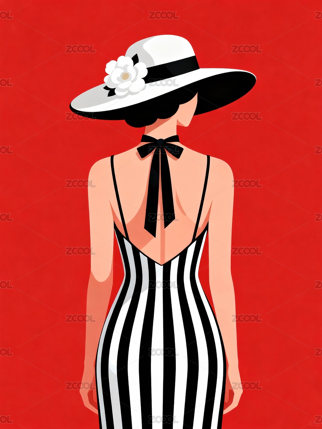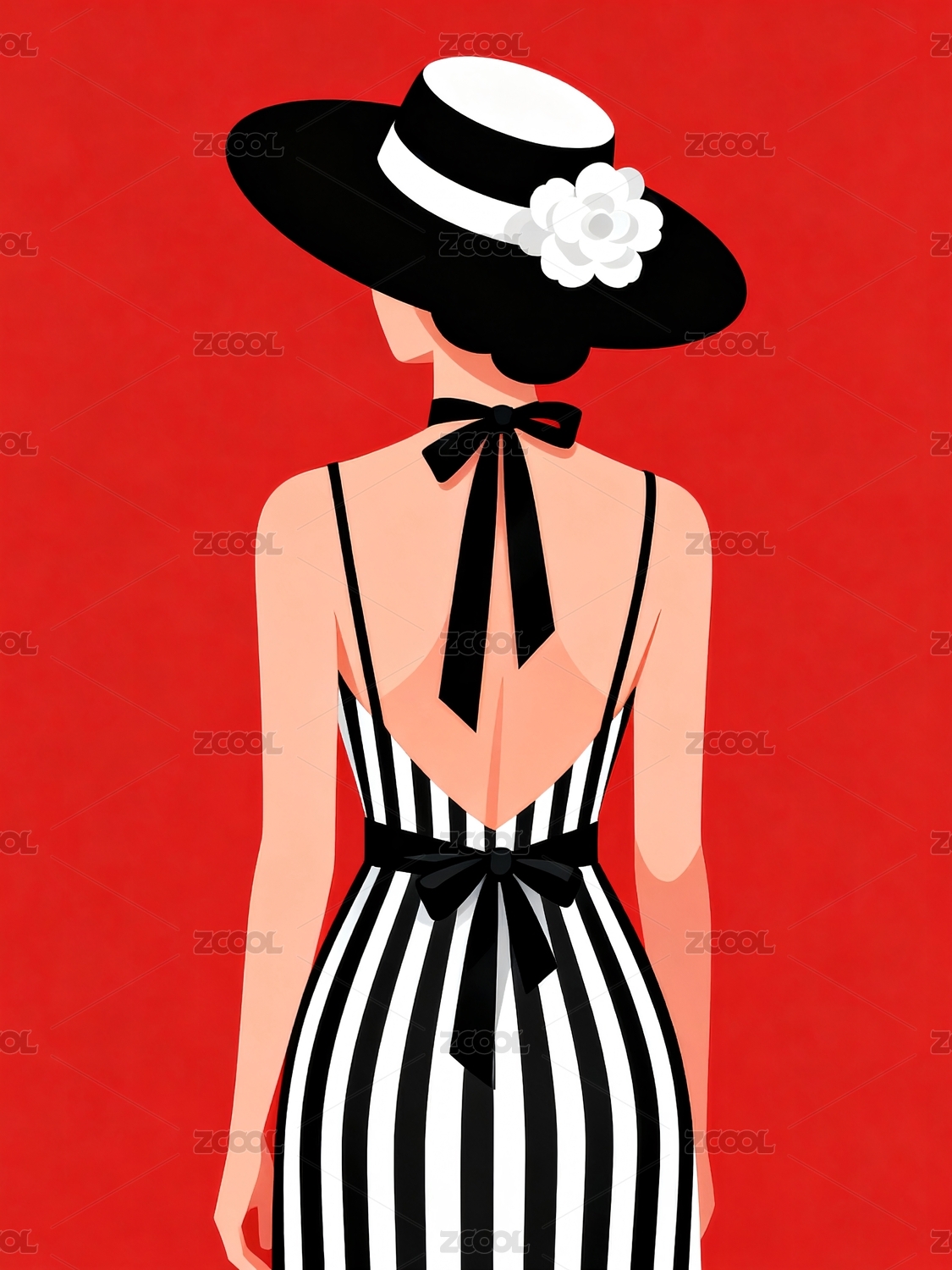 时尚,女性,优雅,红色连衣裙,白色帽子,鲜花,花束,红花,插画,线条画