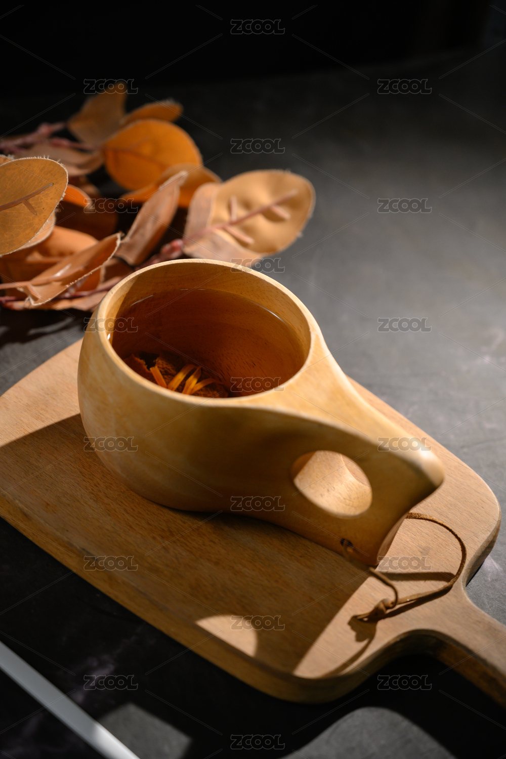 桌面上的杯子里的甘甜可口的胰岛果茶
