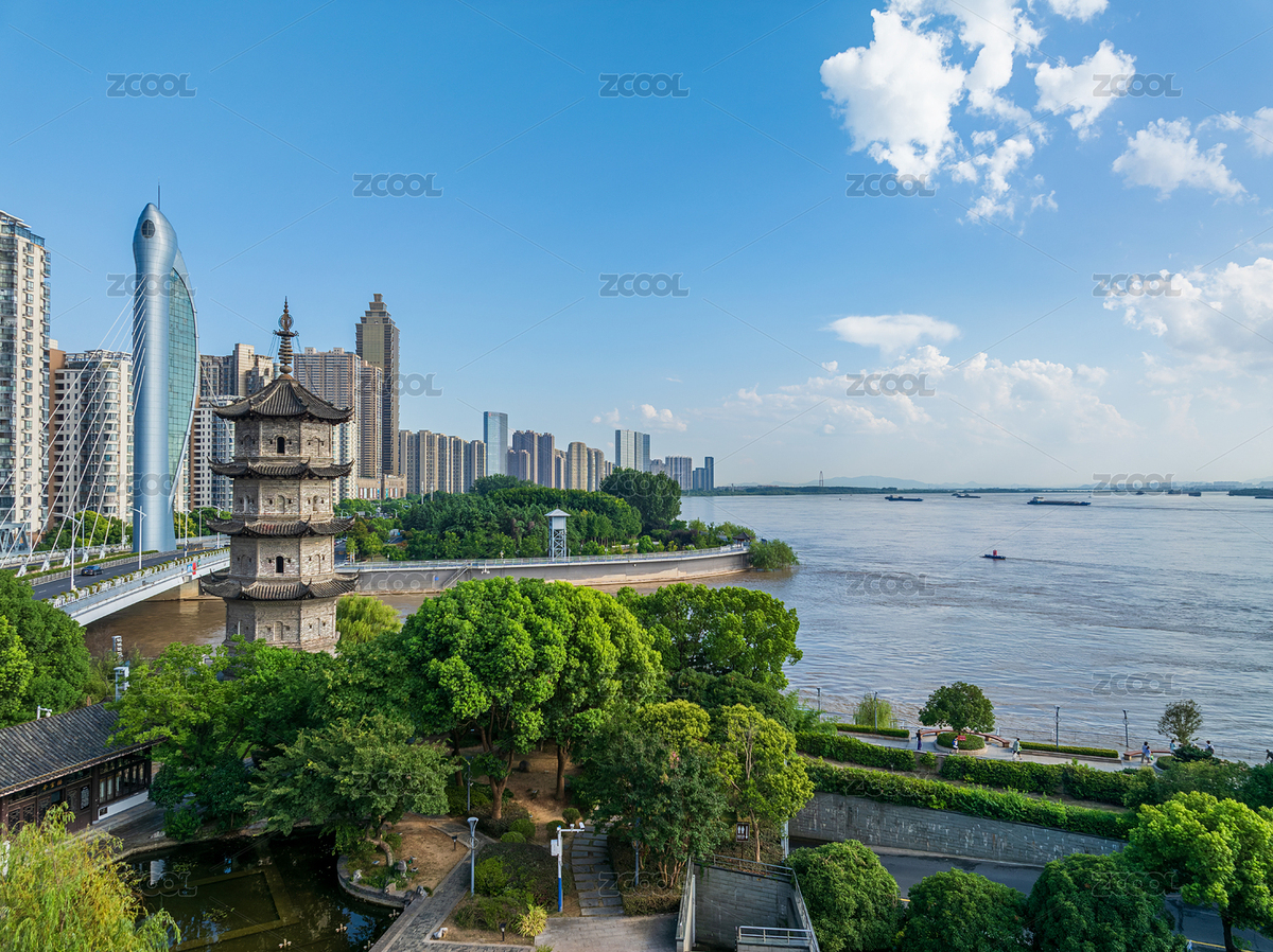 夏季白天航拍安徽芜湖长江沿岸中江塔风光