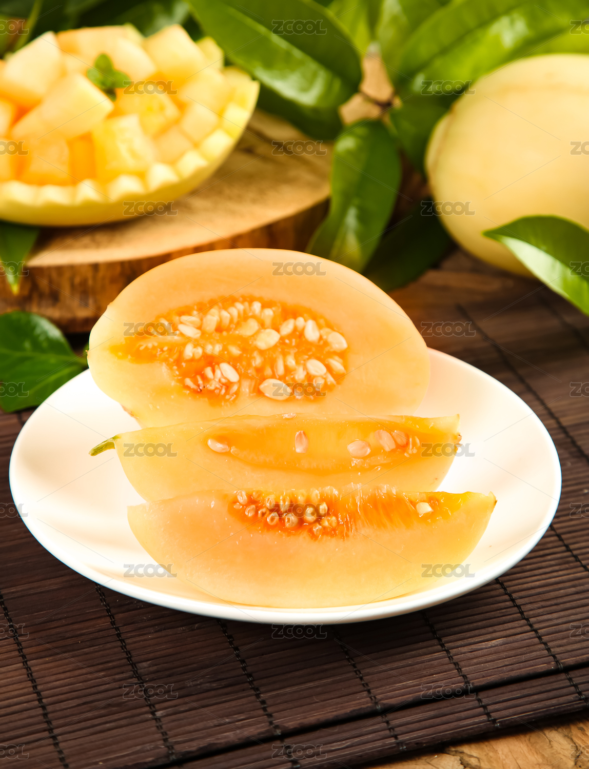 盘子里放着甜瓜果肉和叉子上叉着甜瓜