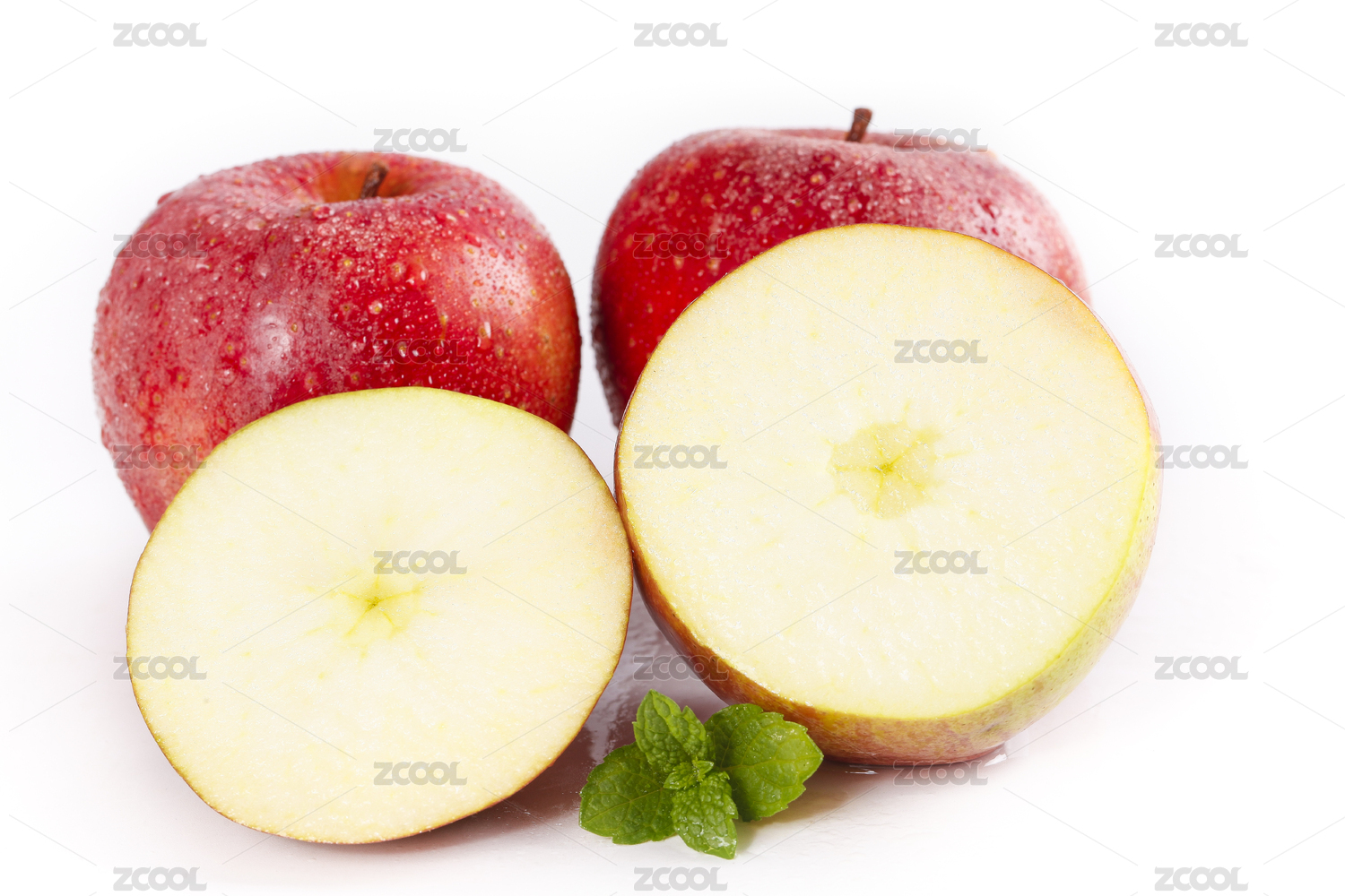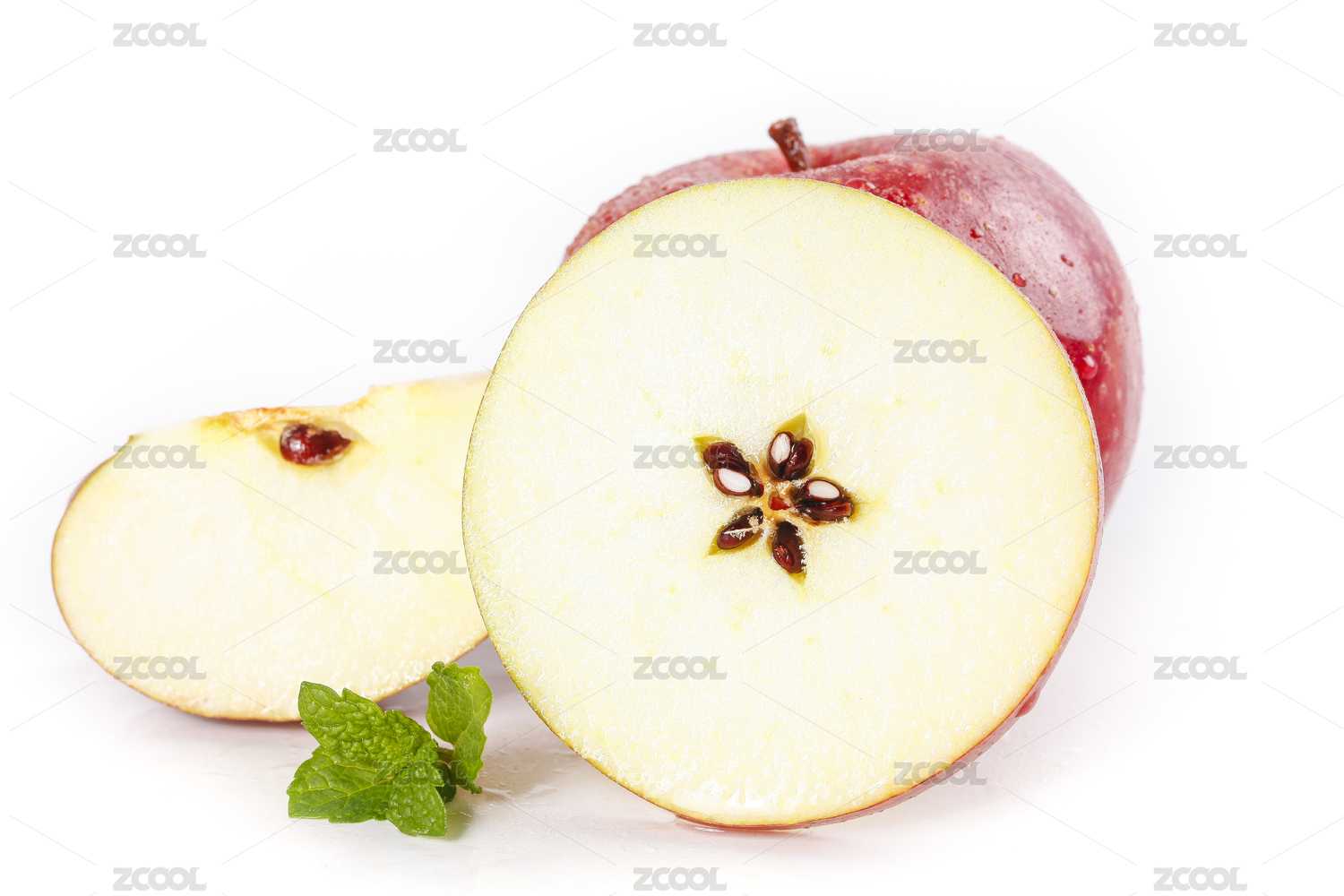 白底上放着新鲜秦冠丑苹果和苹果果肉