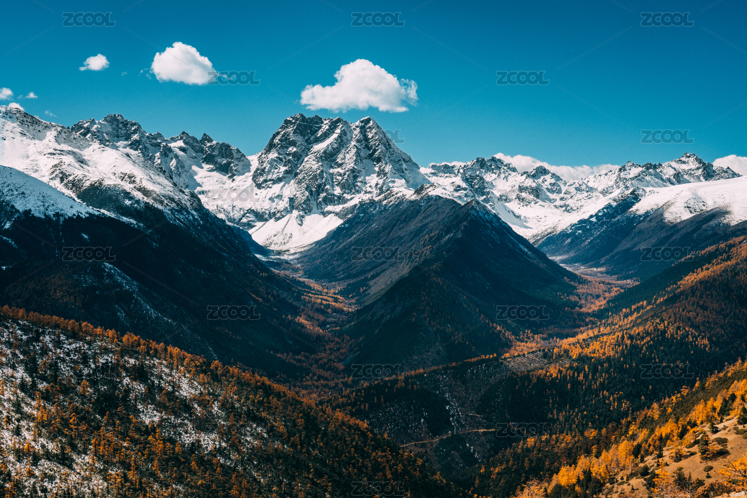 云南德钦白马雪山蓝天白云金黄色森林