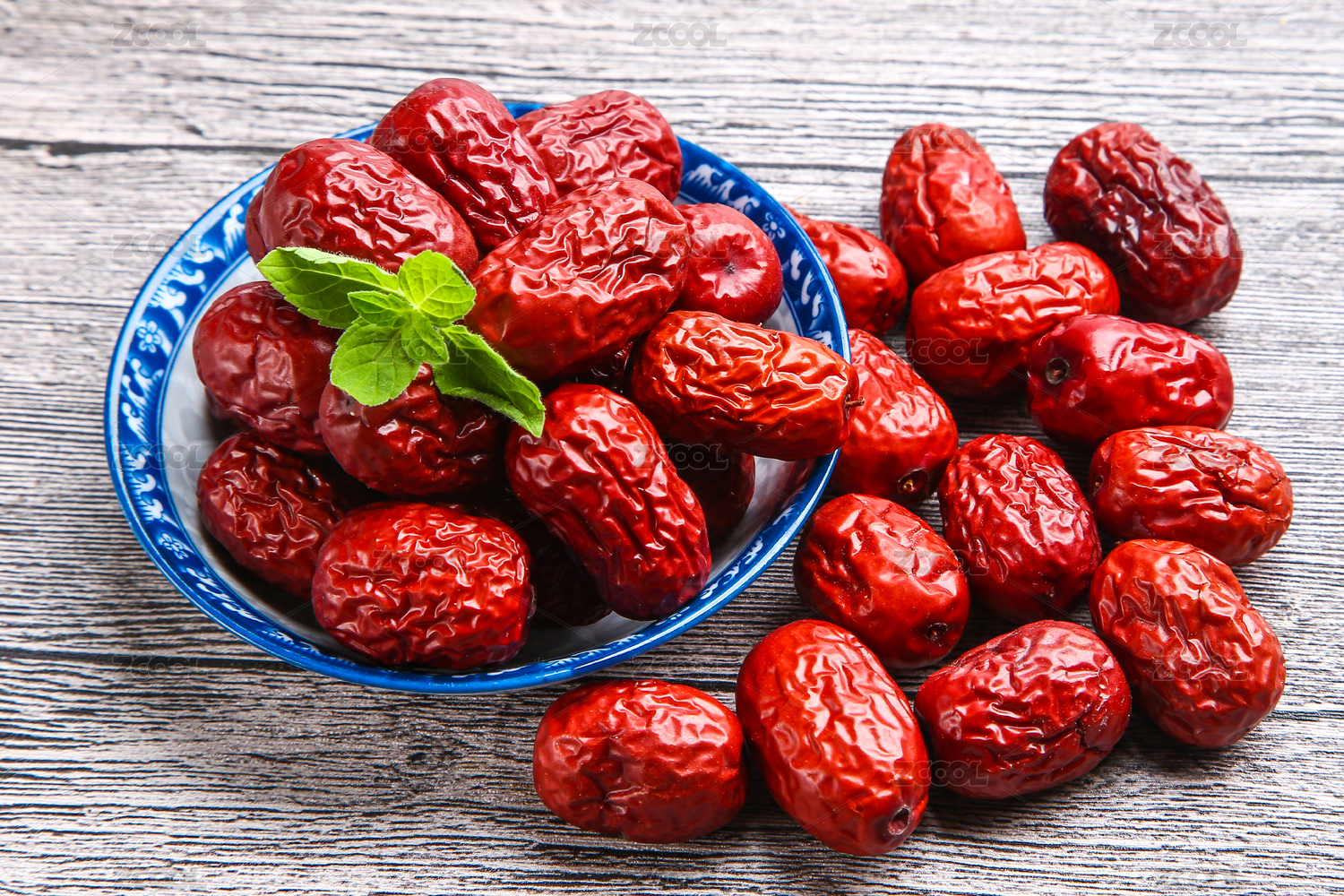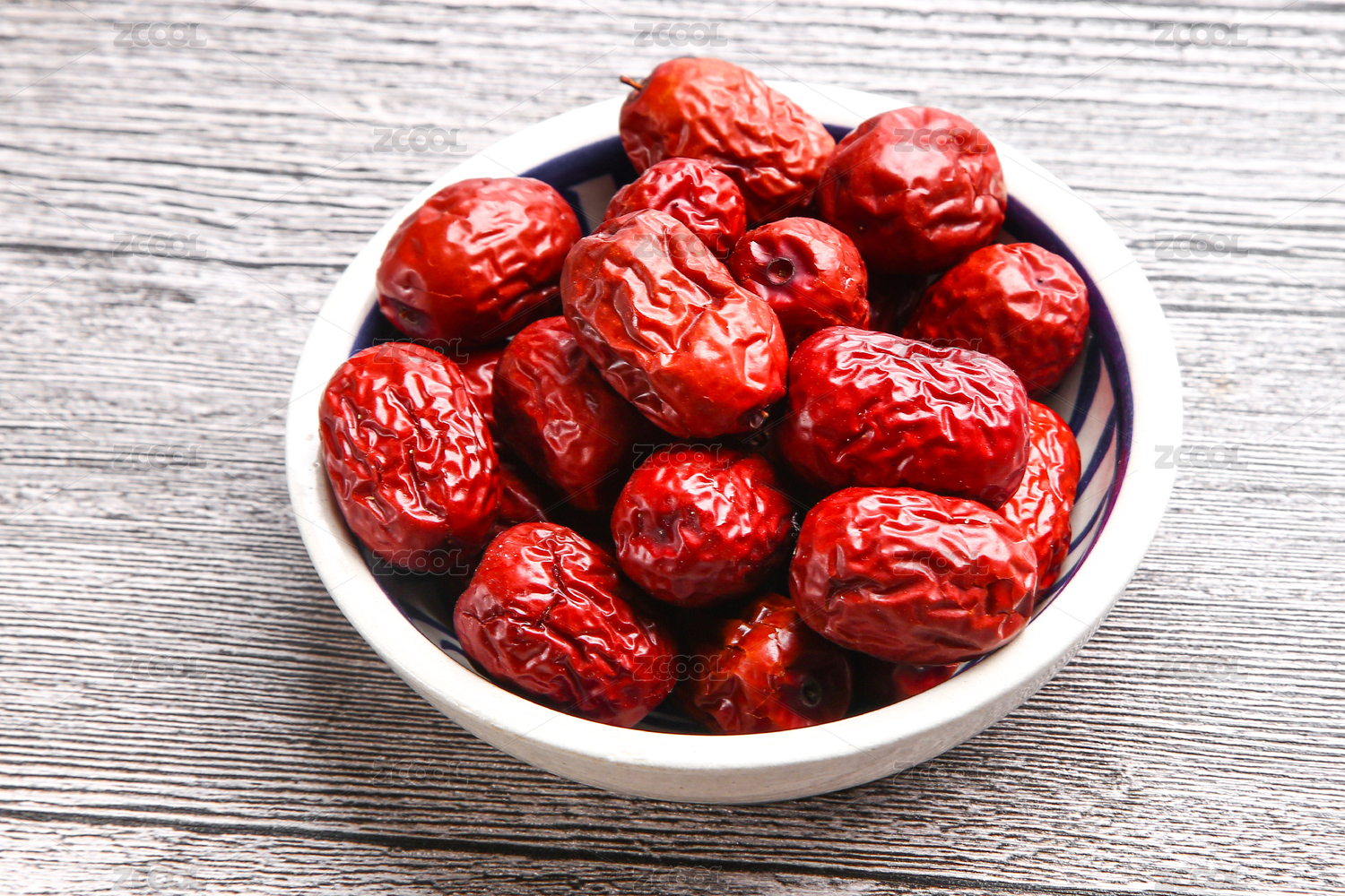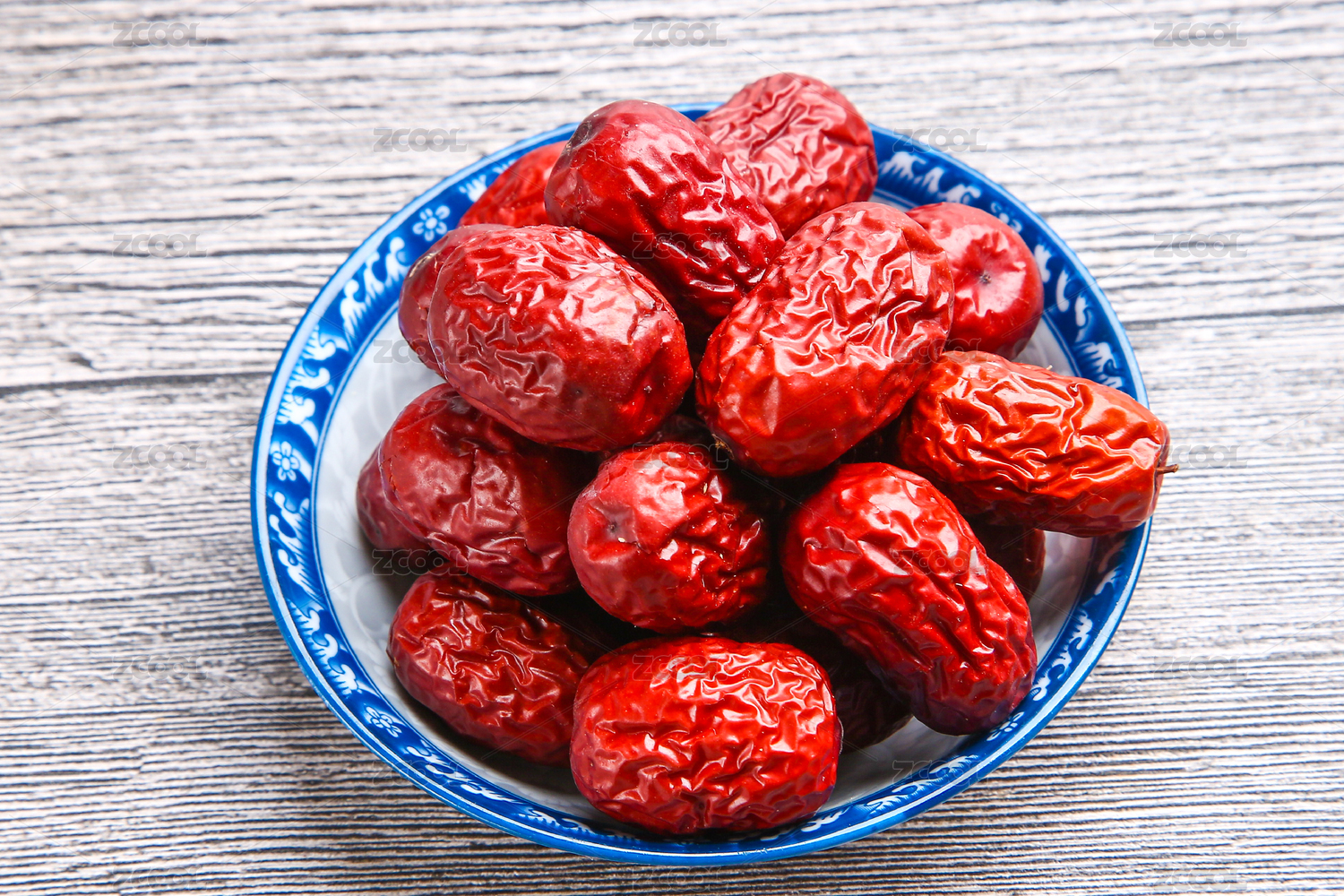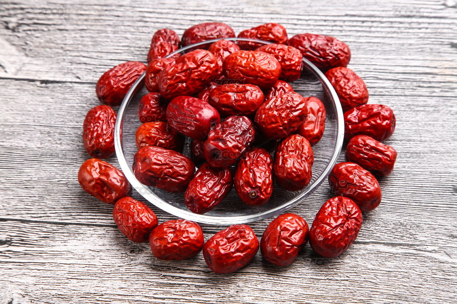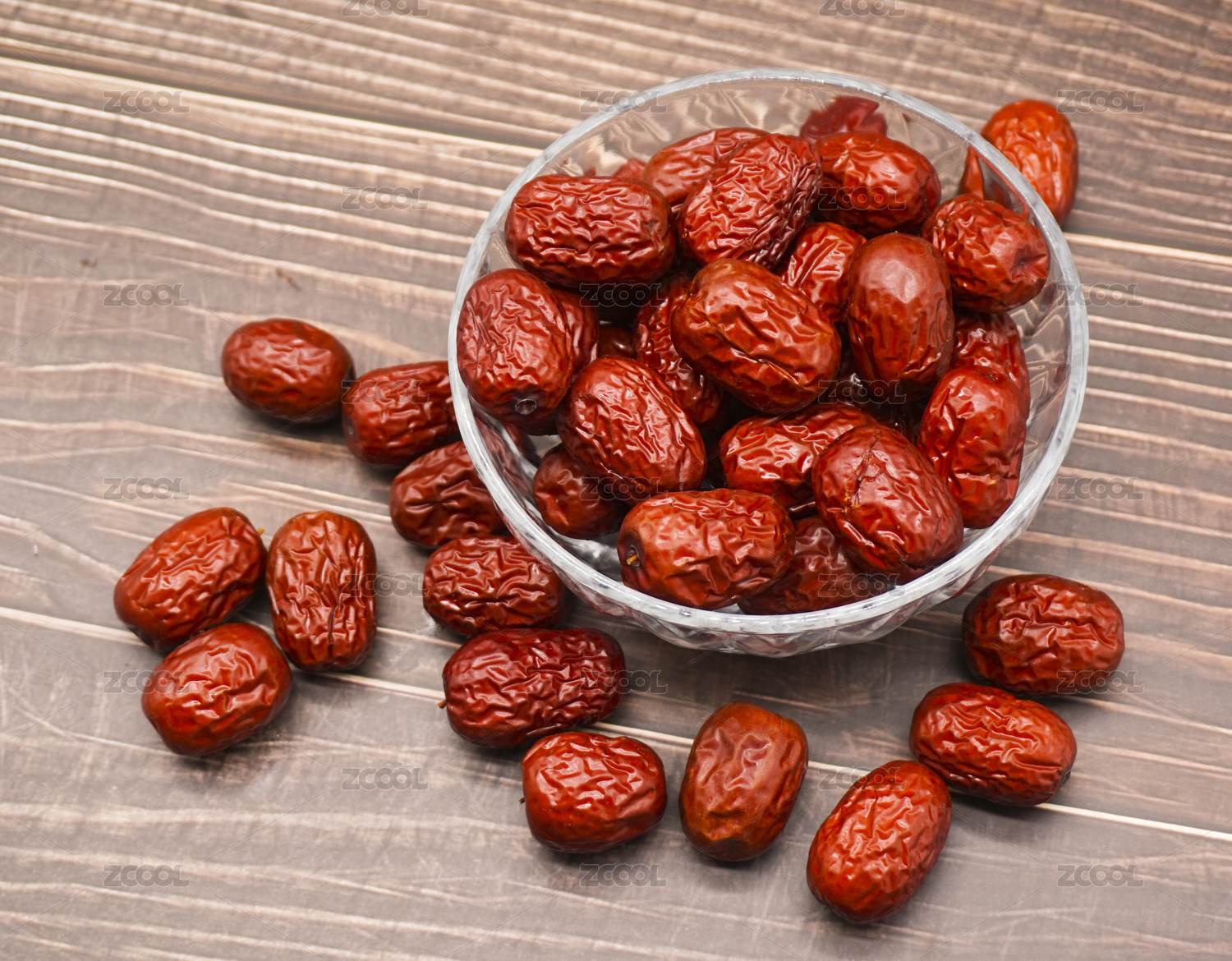 木桌背景中放于水晶碗中的树上吊干红枣特写