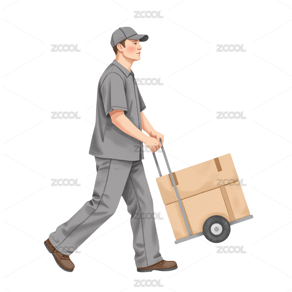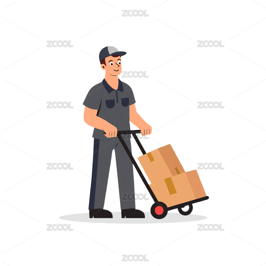 蓝衣服快递员推着拖车送快递3D元素