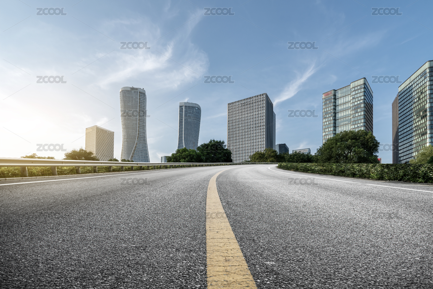 高速公路路面和杭州现代建筑天际线