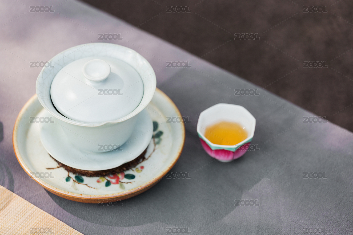 盖碗茶三才杯摆放在窗棂影木桌面上