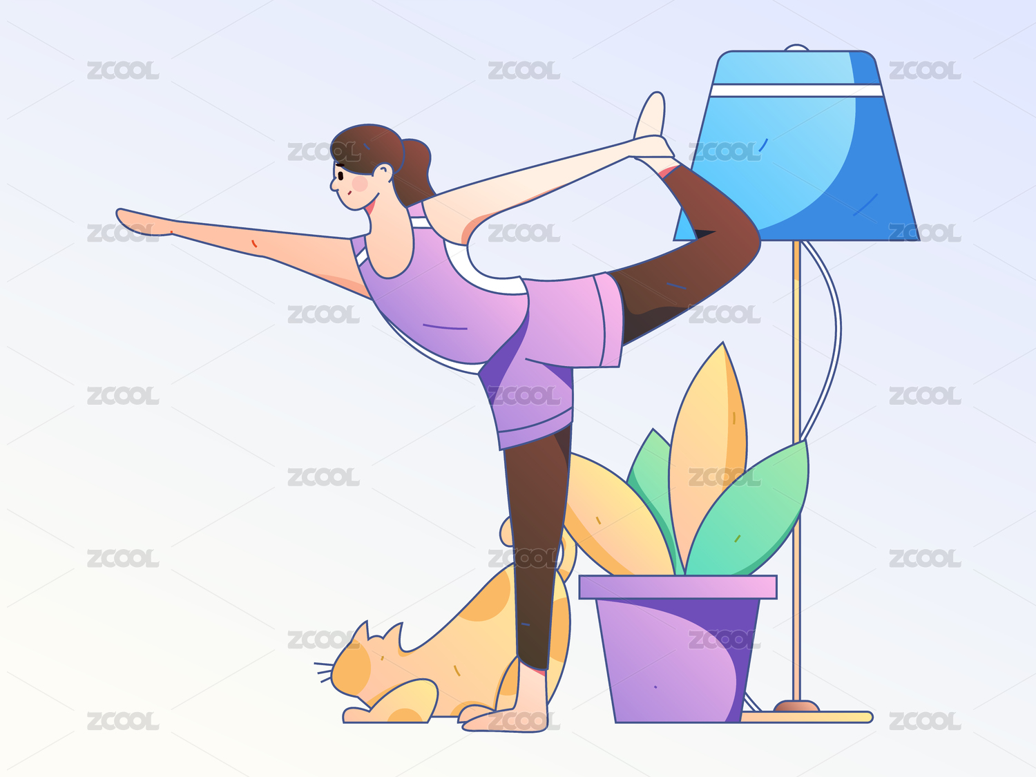 夏天女孩健身减肥瑜伽锻炼教练直播跳操插画