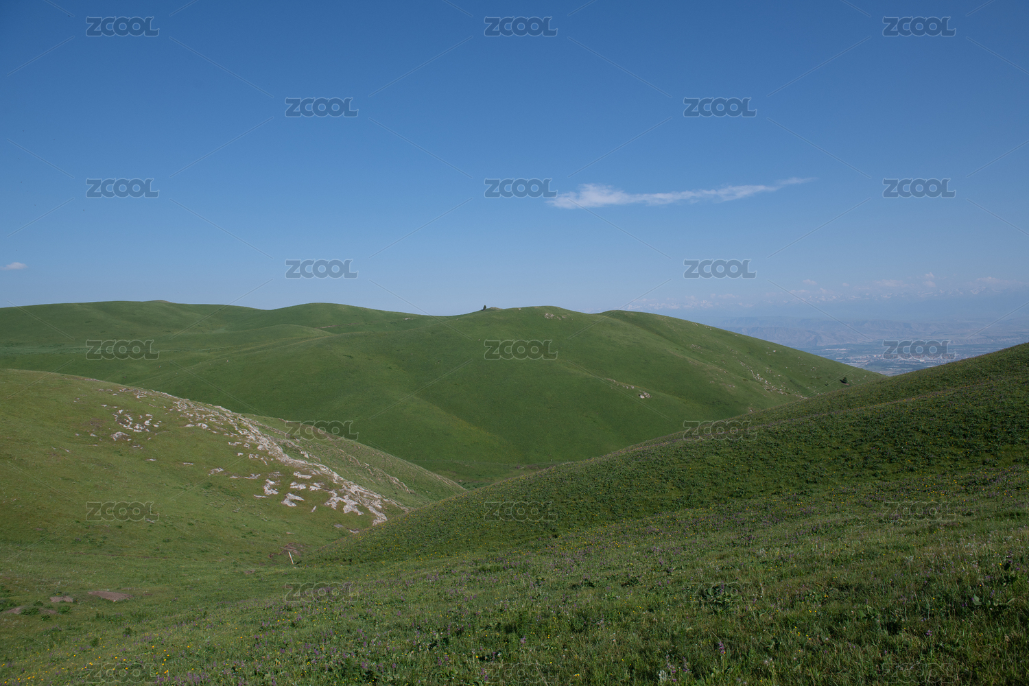 中国新疆夏季晴天蓝色天空下绿色的大草原