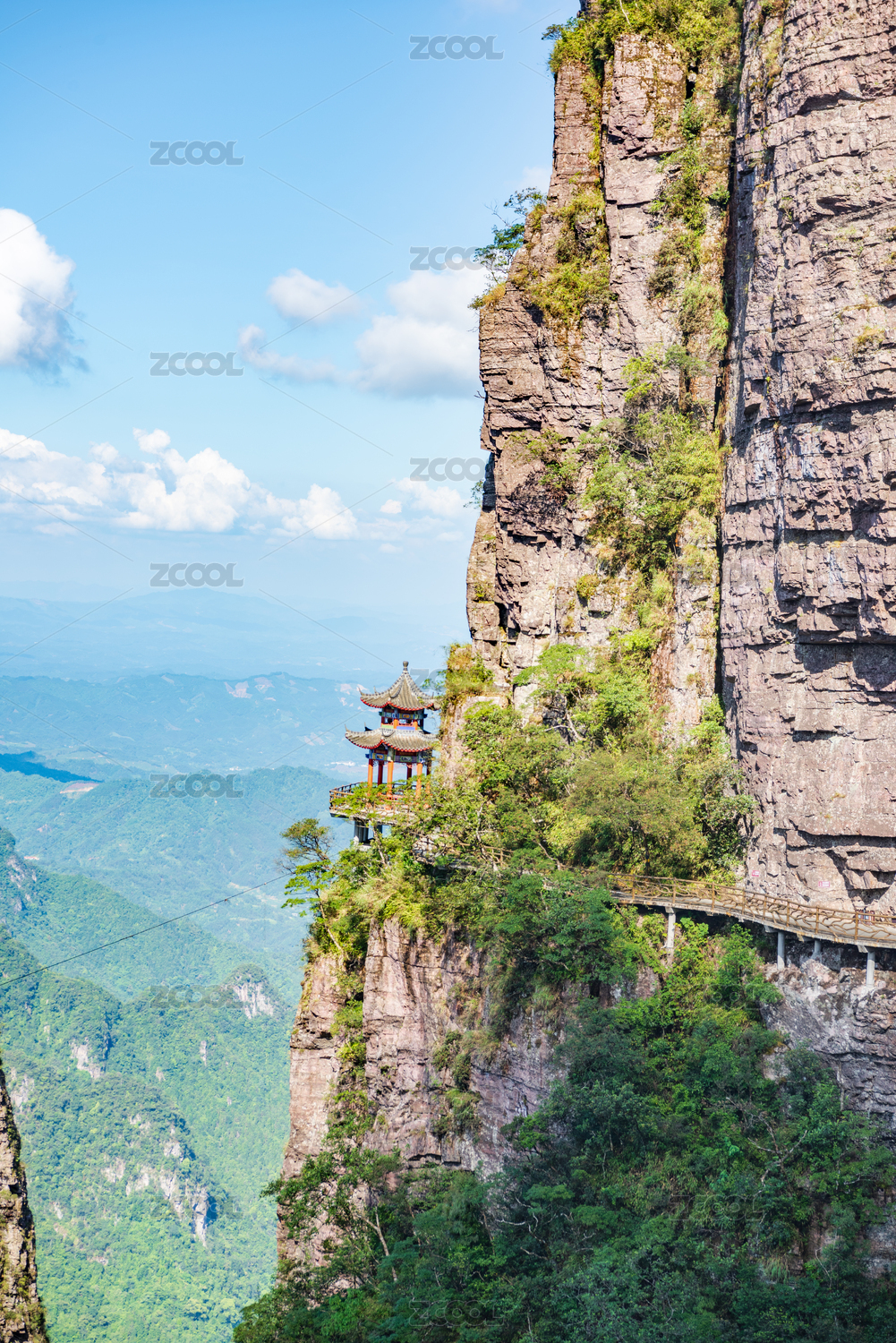 湖北恩施大峡谷的云雾缭绕的绝壁和栈道