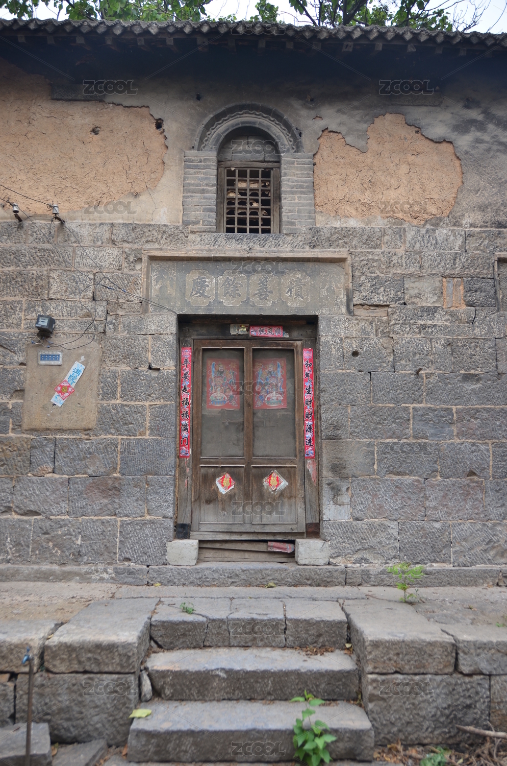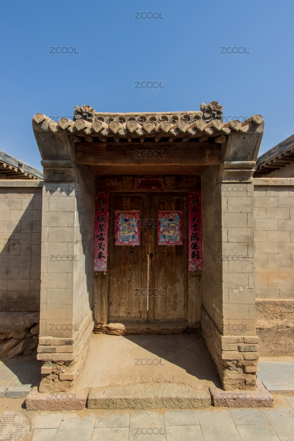 仰拍青砖灰瓦装饰的传统民居木质大门