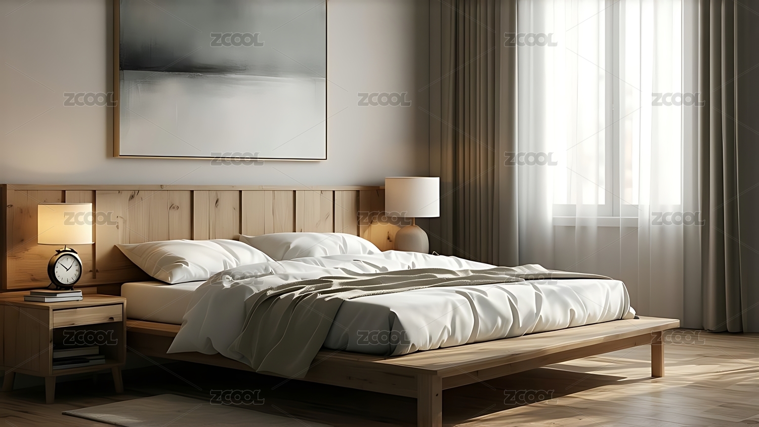 简约卧室木质床铺与温馨灯光营造宁静氛围