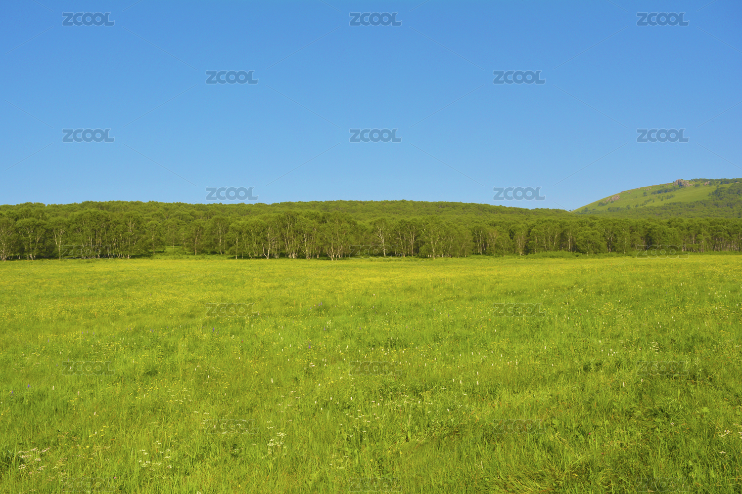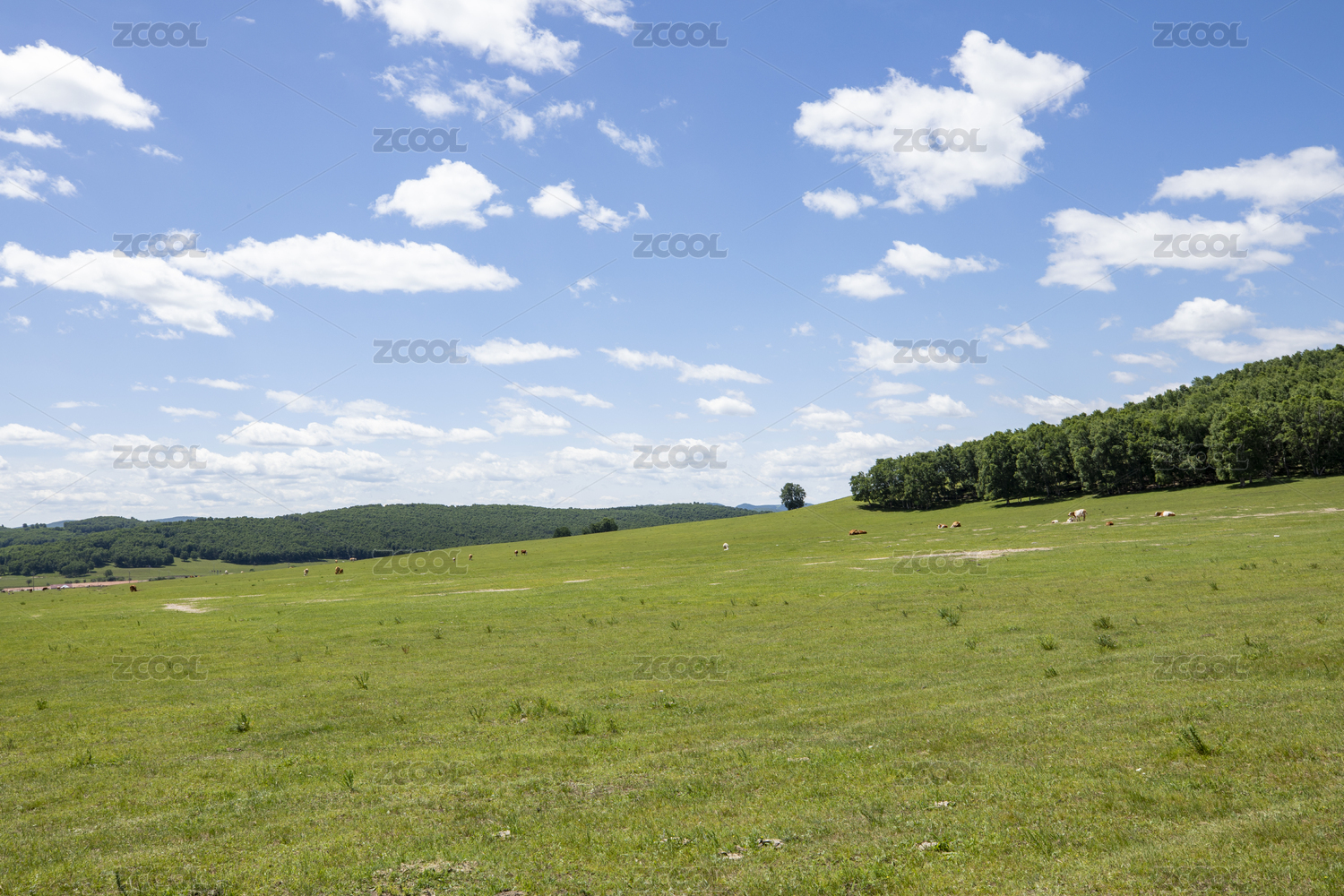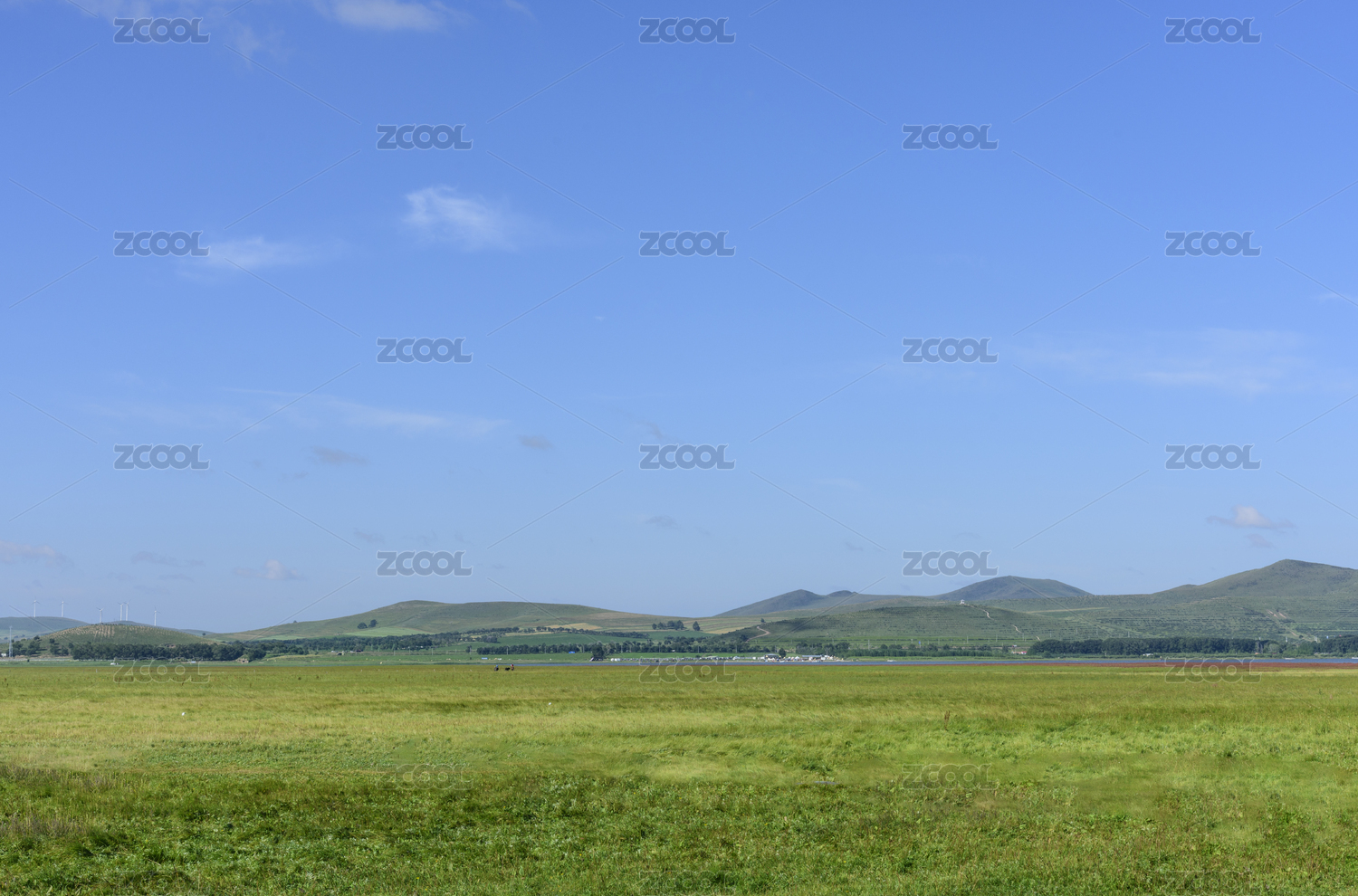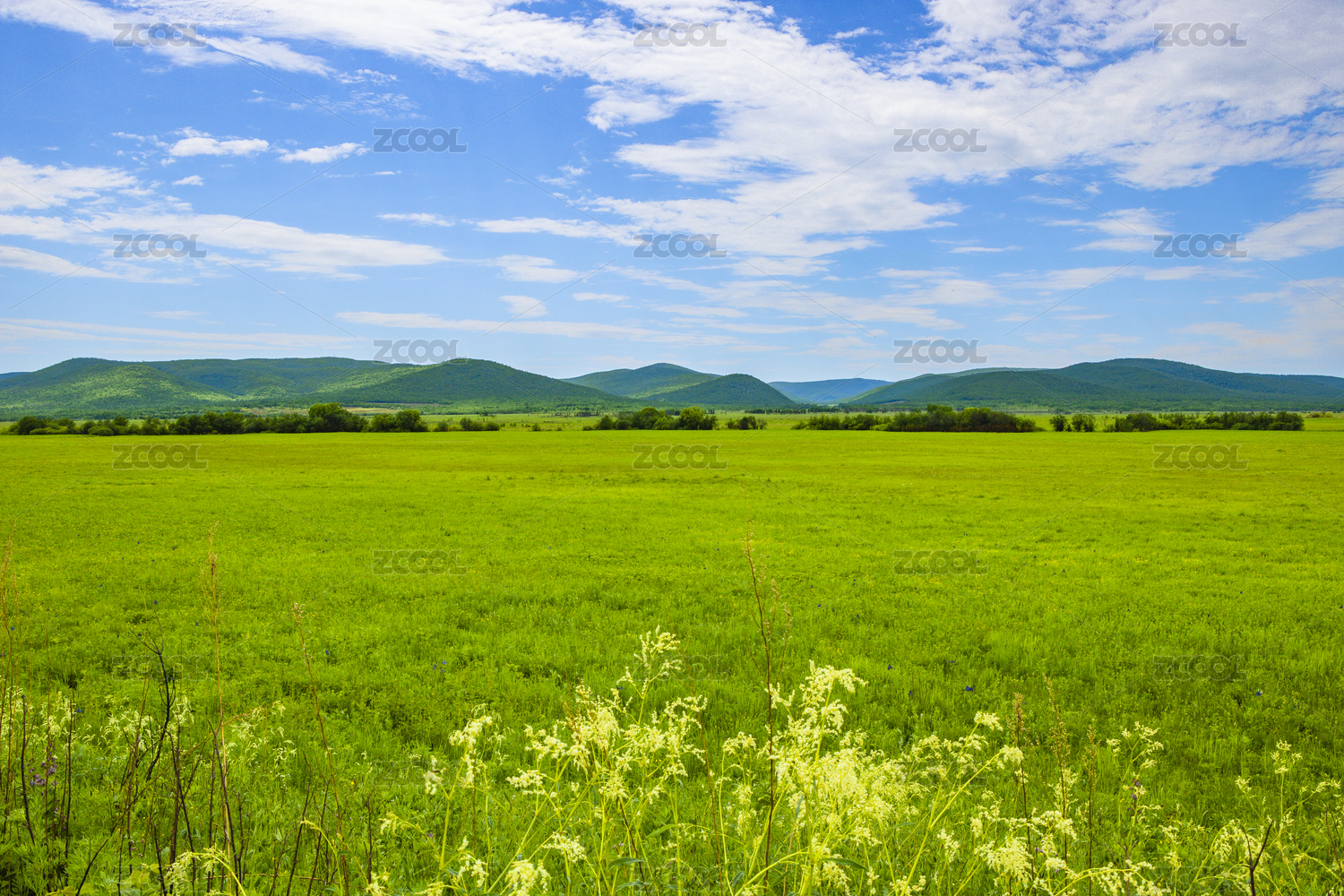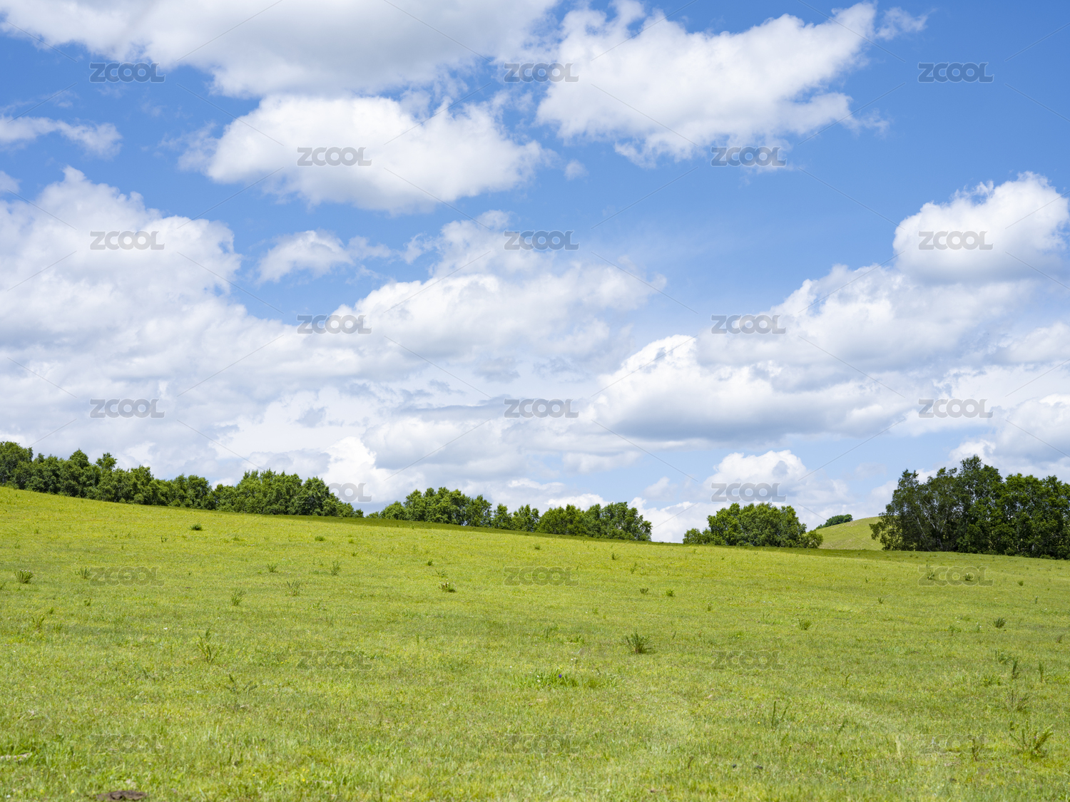 中国辽宁沈阳辽河岸边蓝天白云希树草原夏日风光