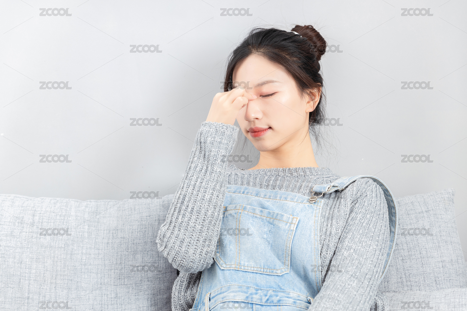 坐在沙发上感觉疲劳的的亚洲女孩