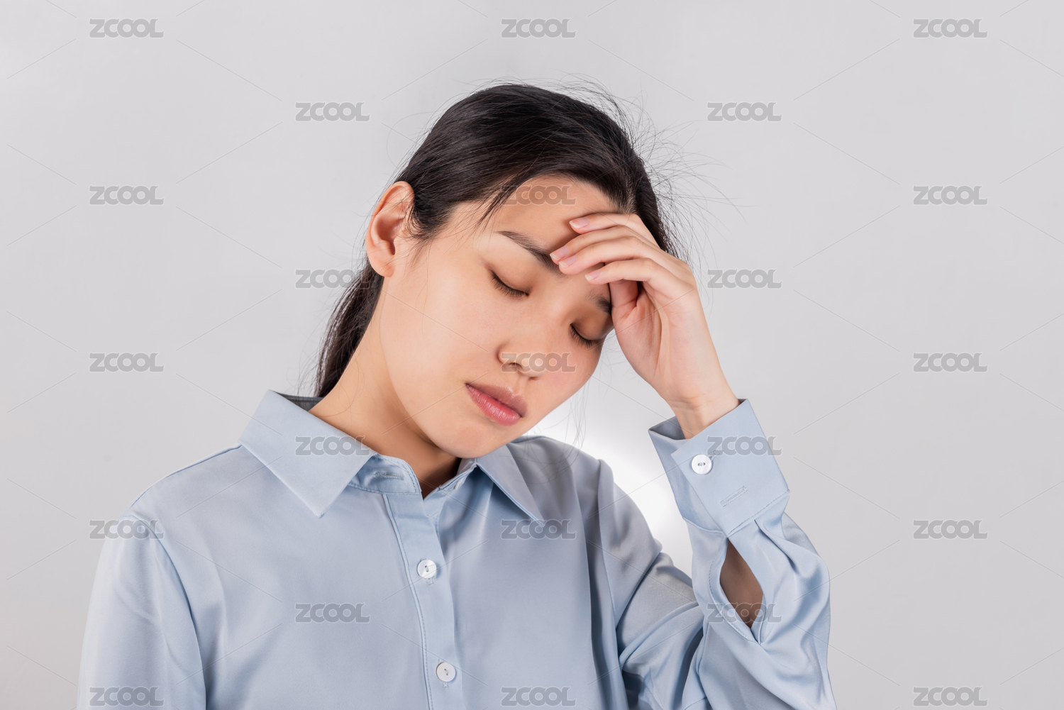 一个中国女白领上班族紧闭眼睛按摩着自己疼痛的头,无法忍受的头疼和头痛