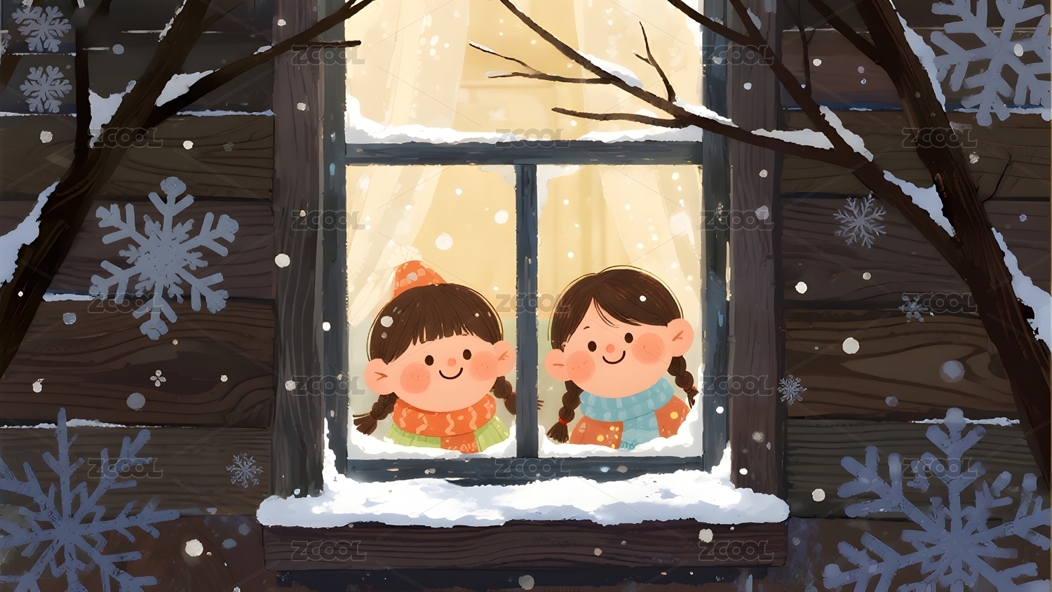 孩子站在窗户前,看窗外冬天雪景,留守儿童
