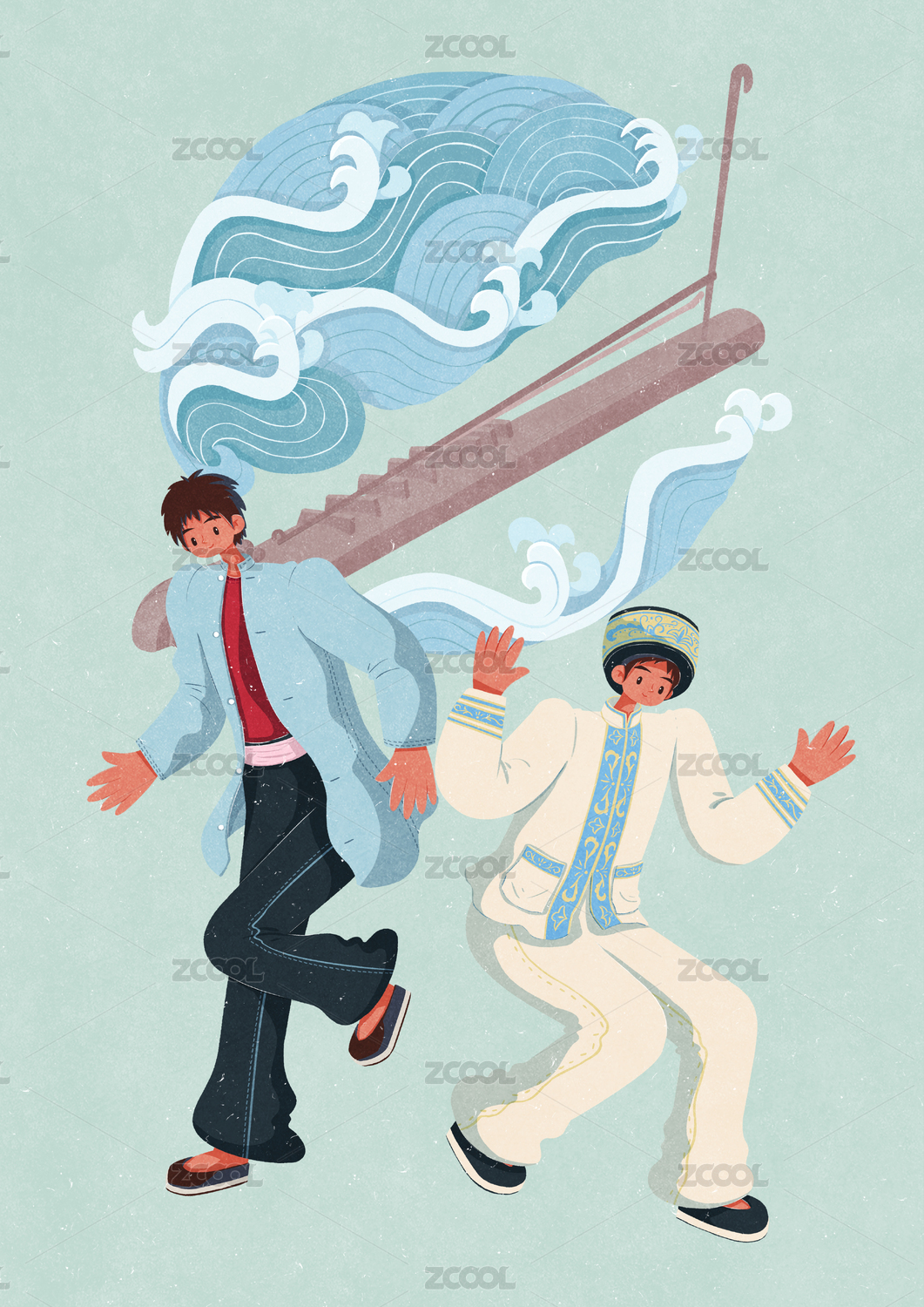 京族,插画,卡通,扁平,少数民族,民族,传统文化,图腾,独弦琴,海洋