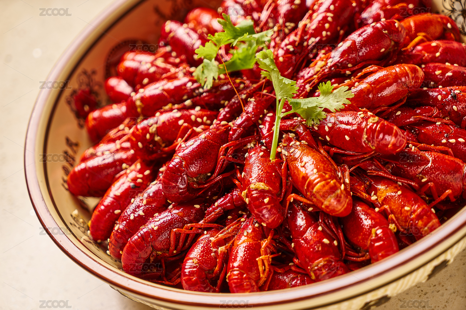 特色美食麻辣小龙虾整齐的摆放在大瓷碗中