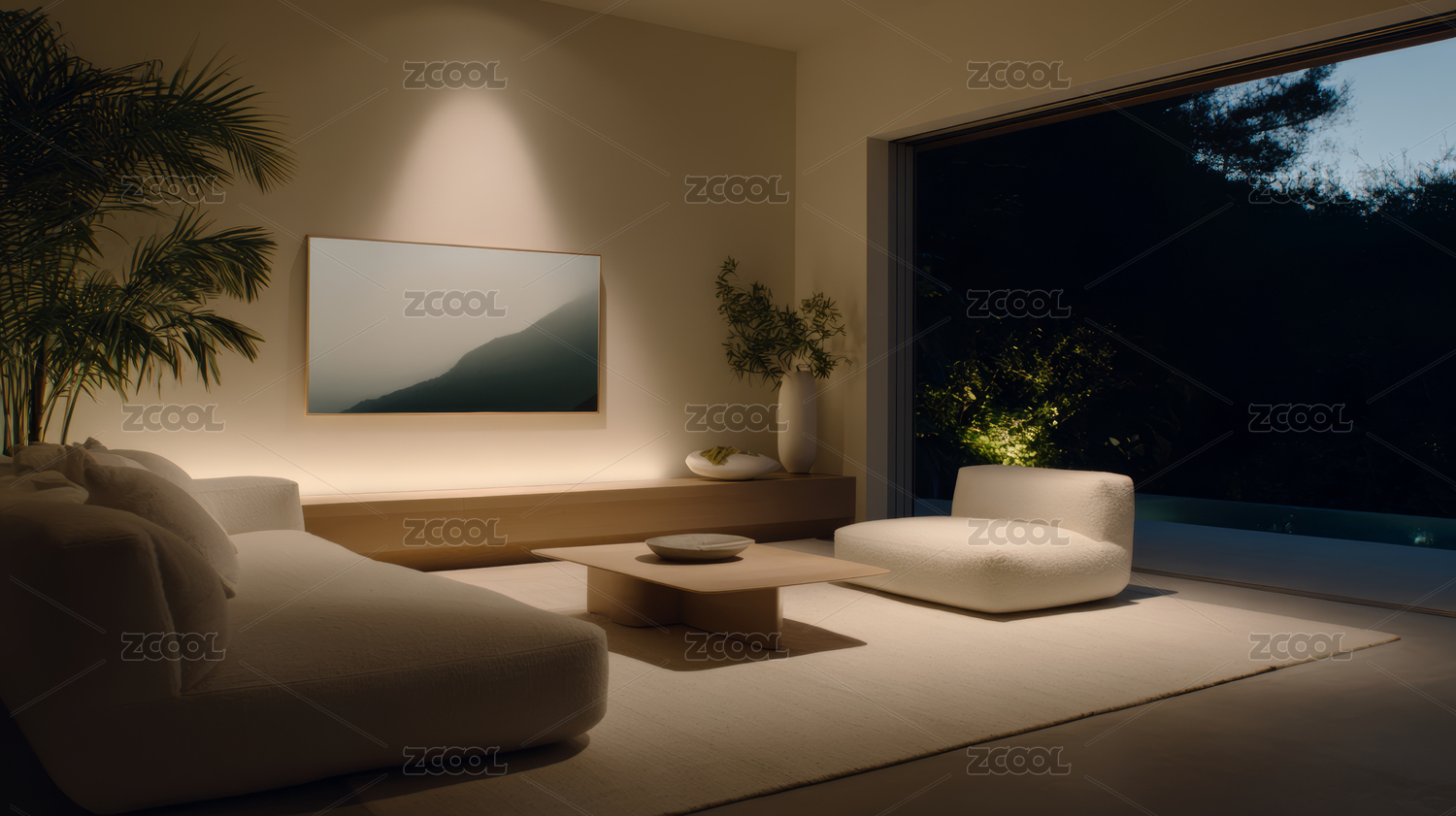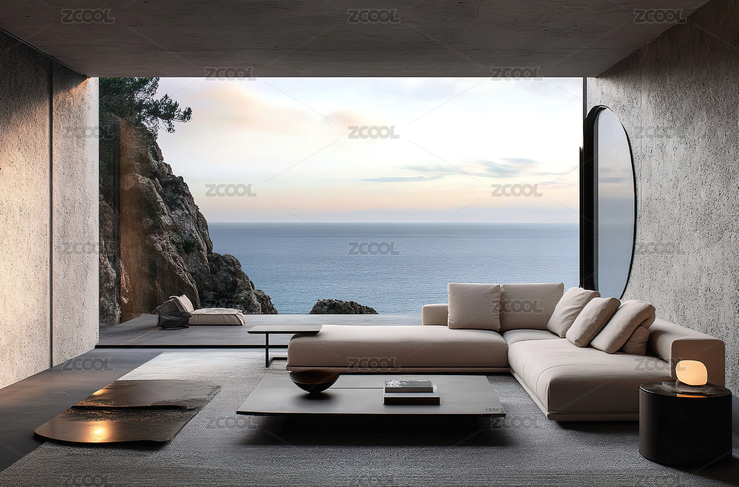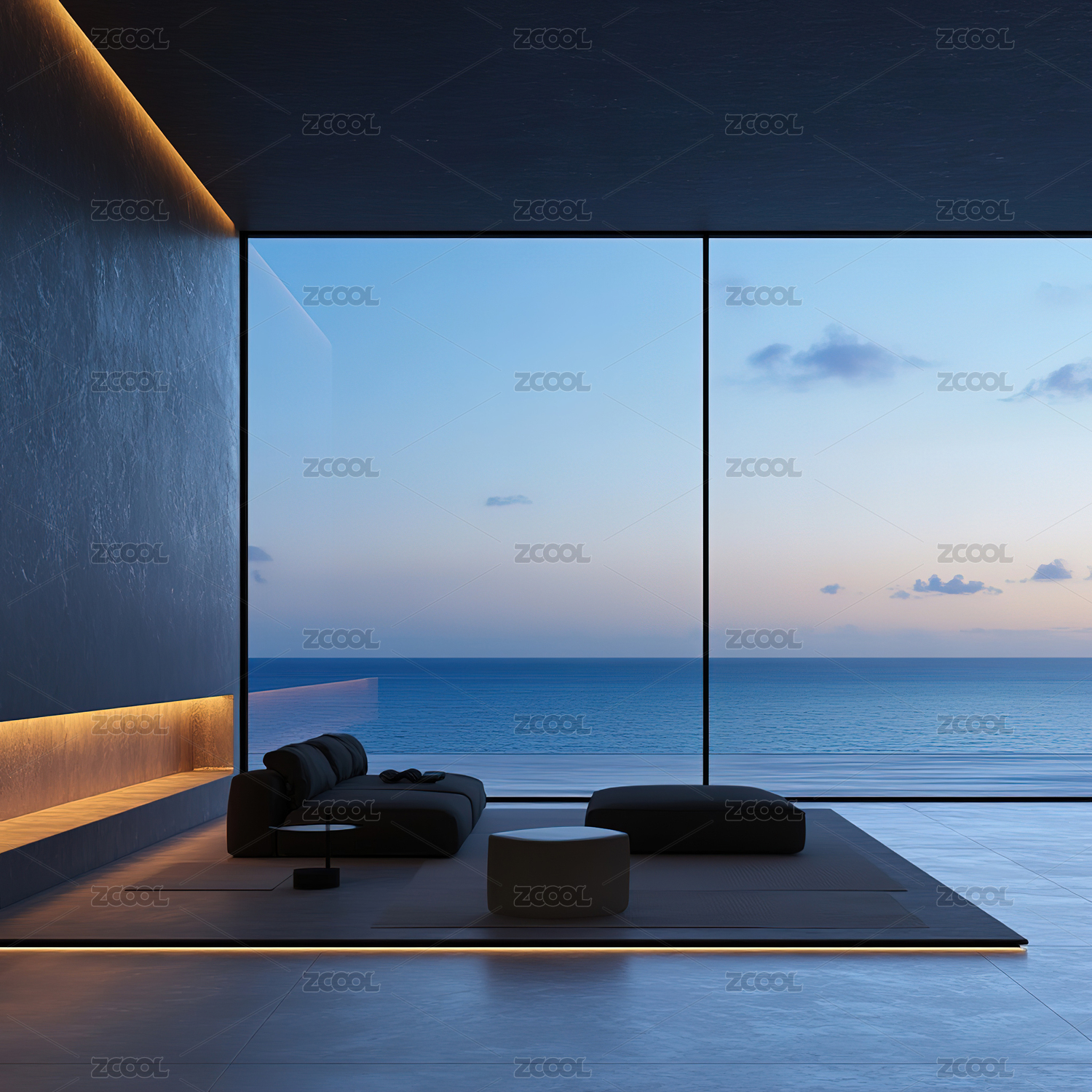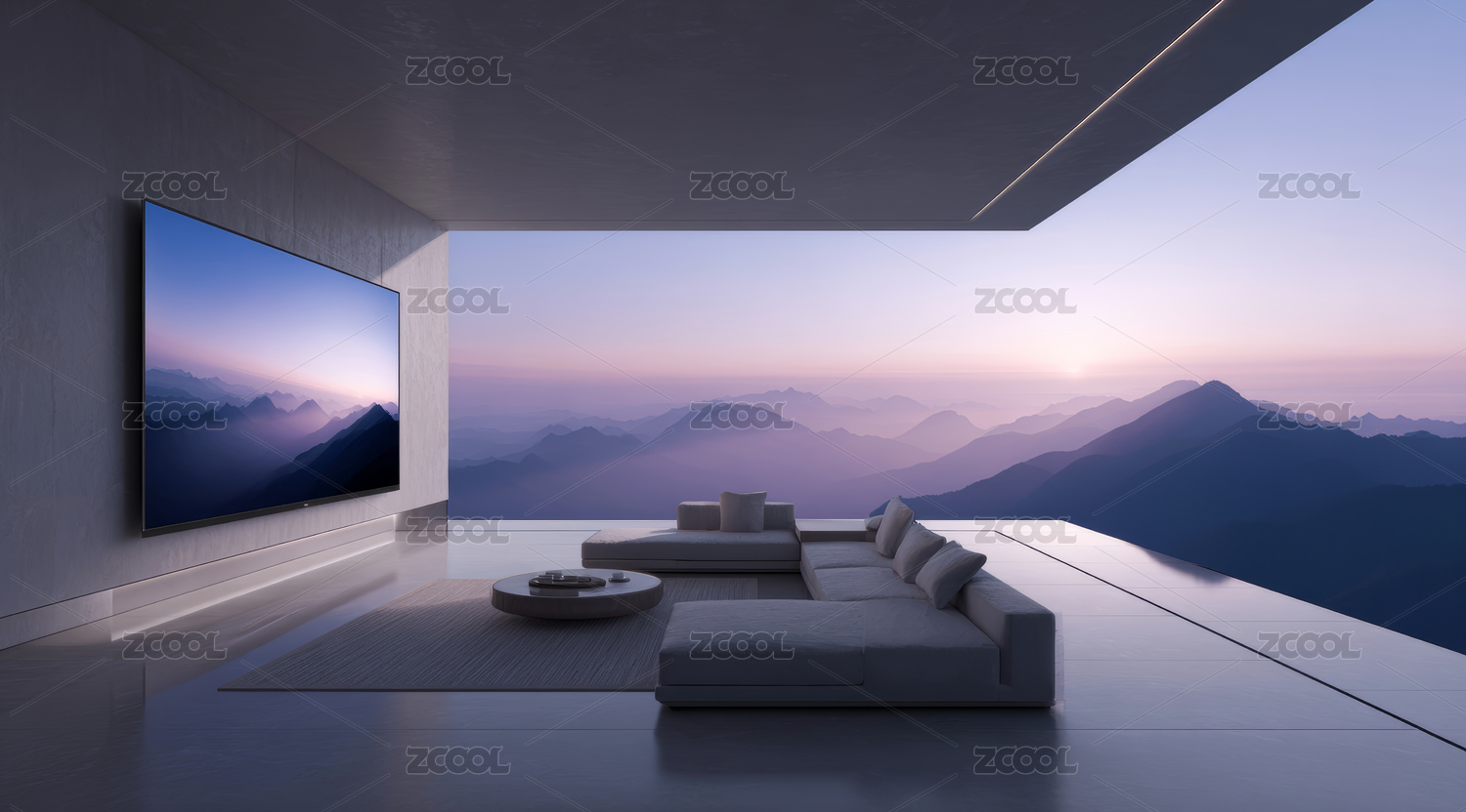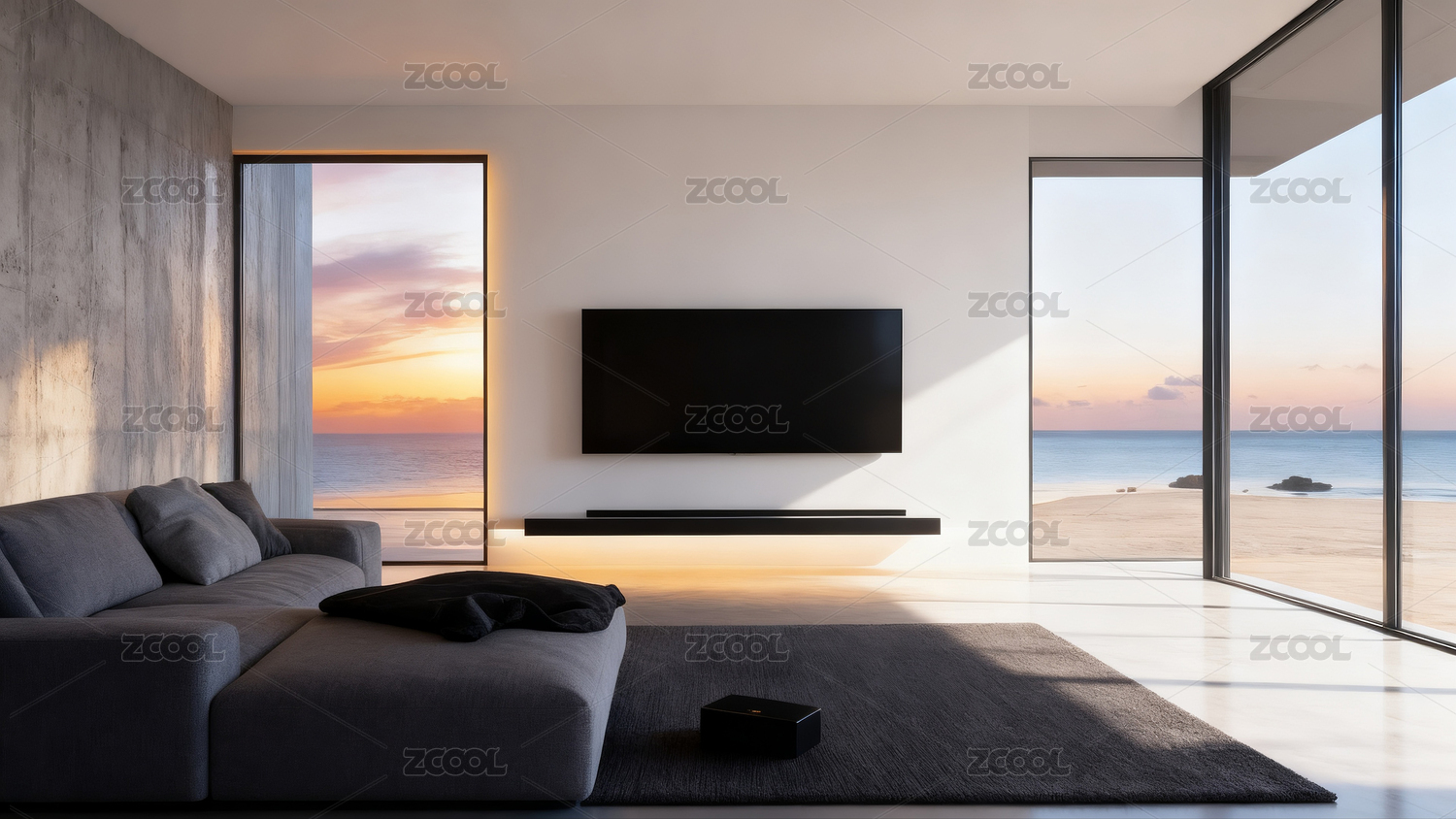 客厅,灰色沙发,小圆桌,低矮茶几,平板电视,大窗户,落地窗,黄昏,山丘,海景