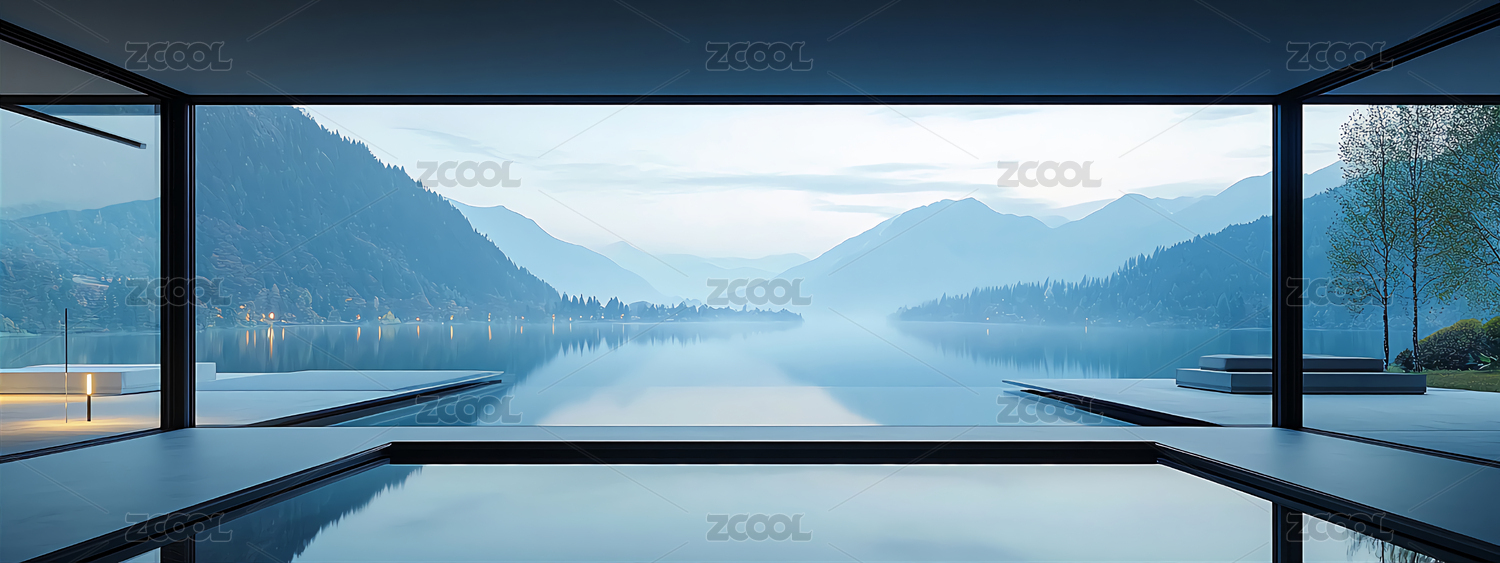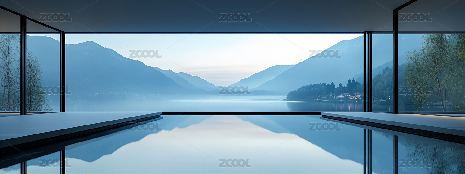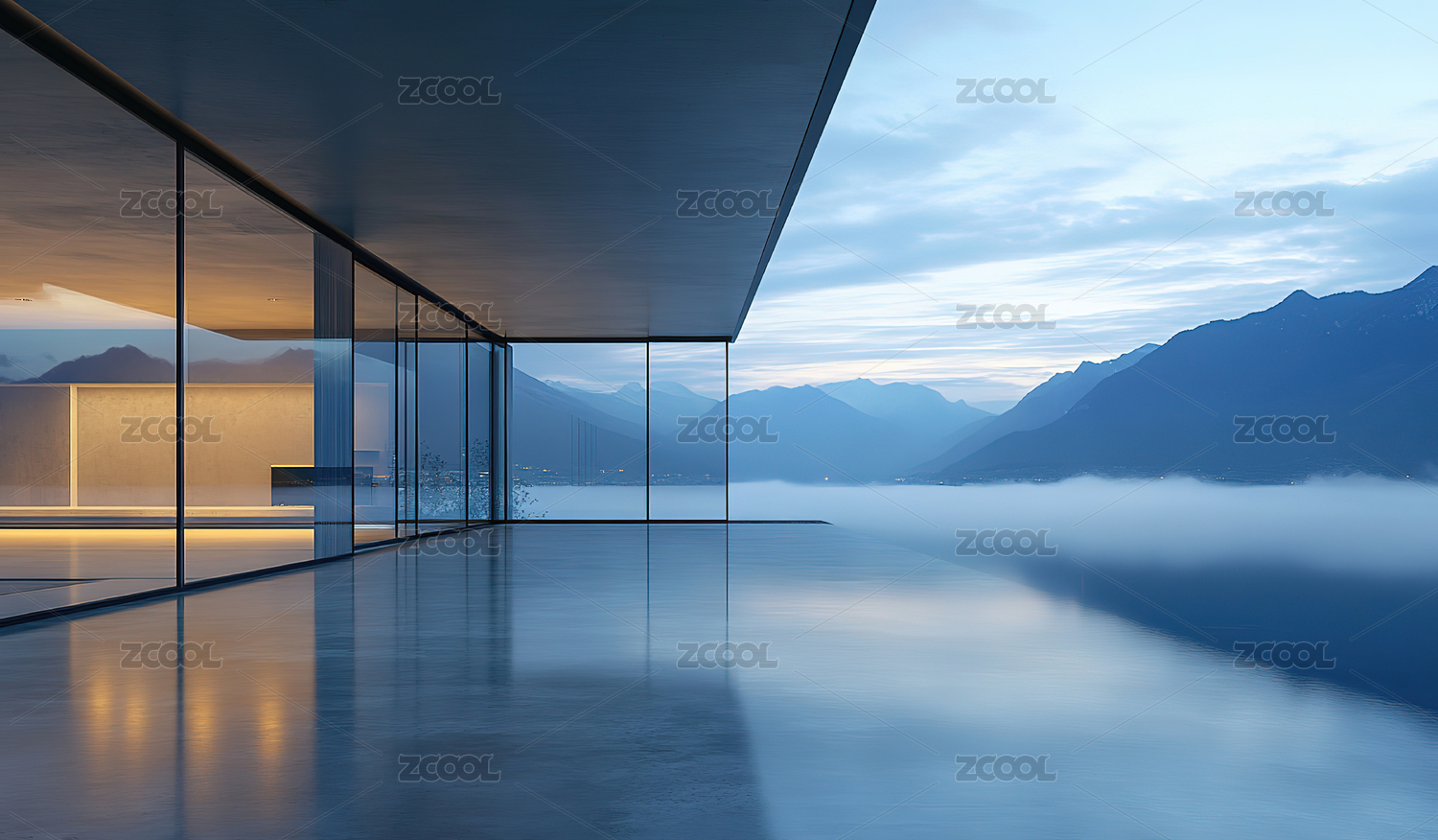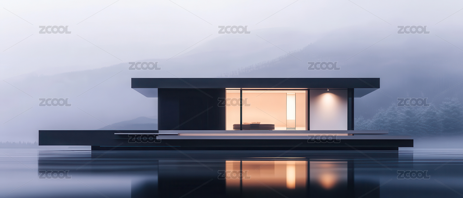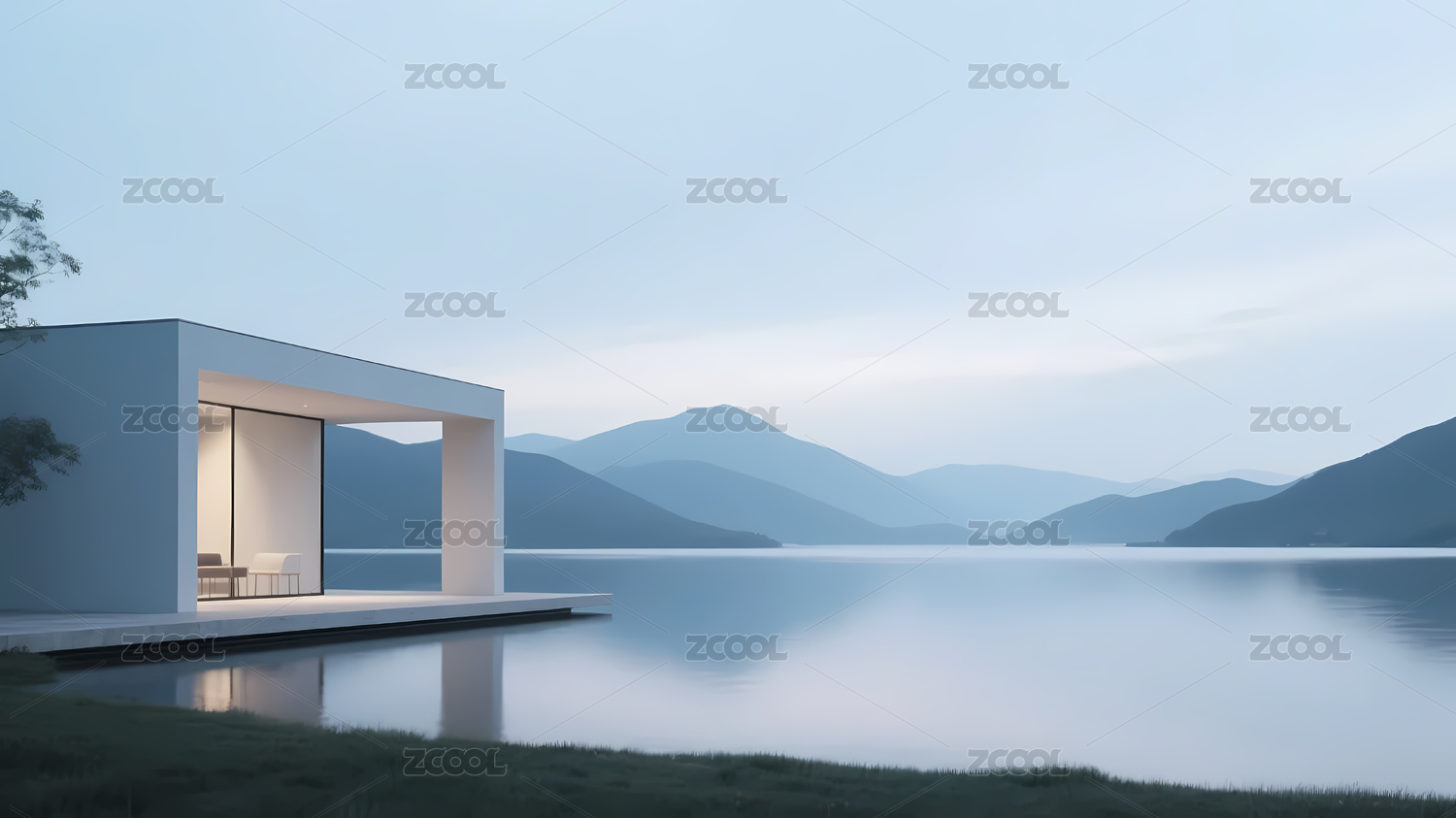 长方形,大窗户,湖,水,阳光,反射,玻璃,建筑,极简,白色