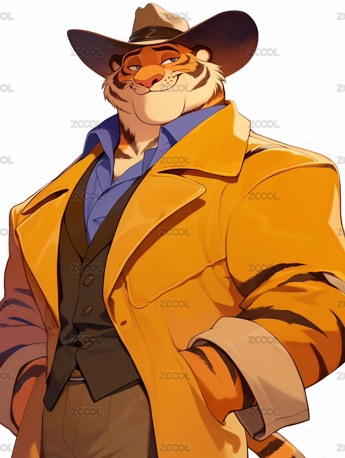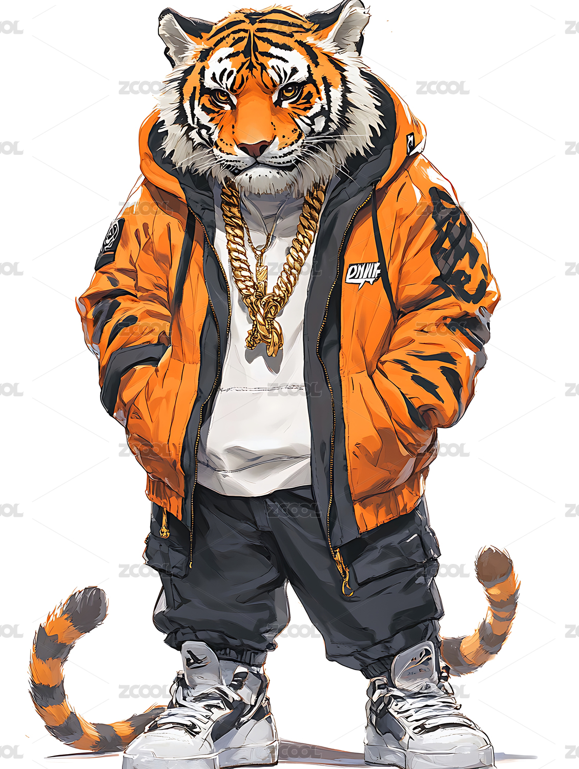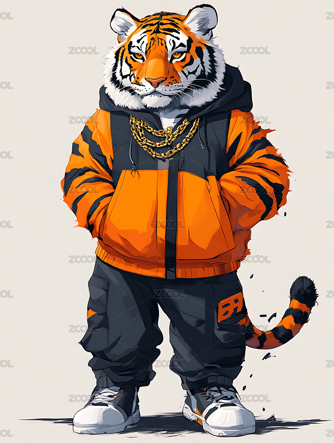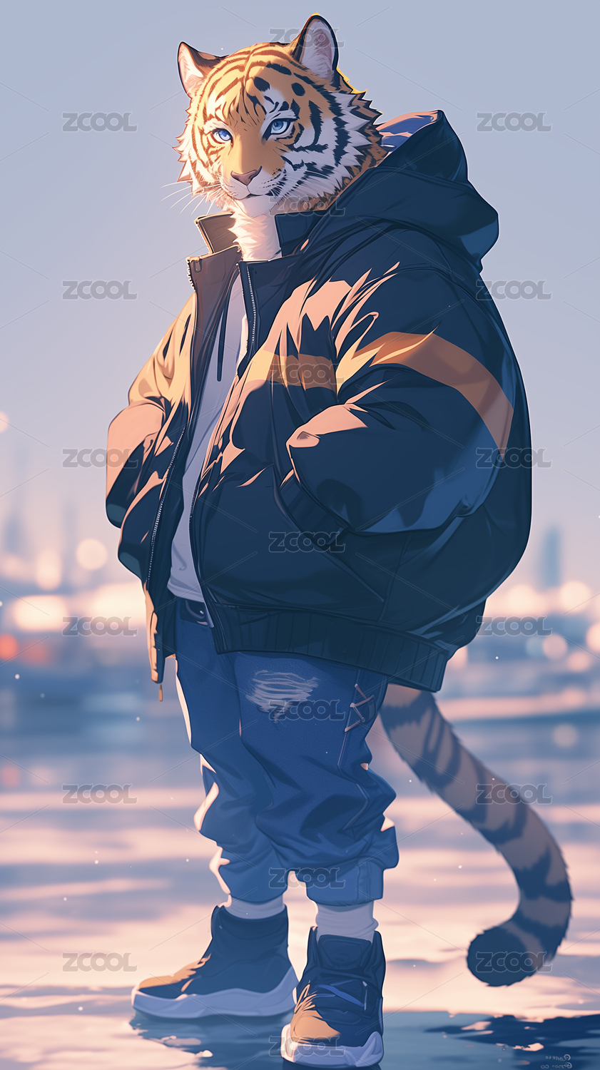 一只穿着外套牛仔裤的老虎插画