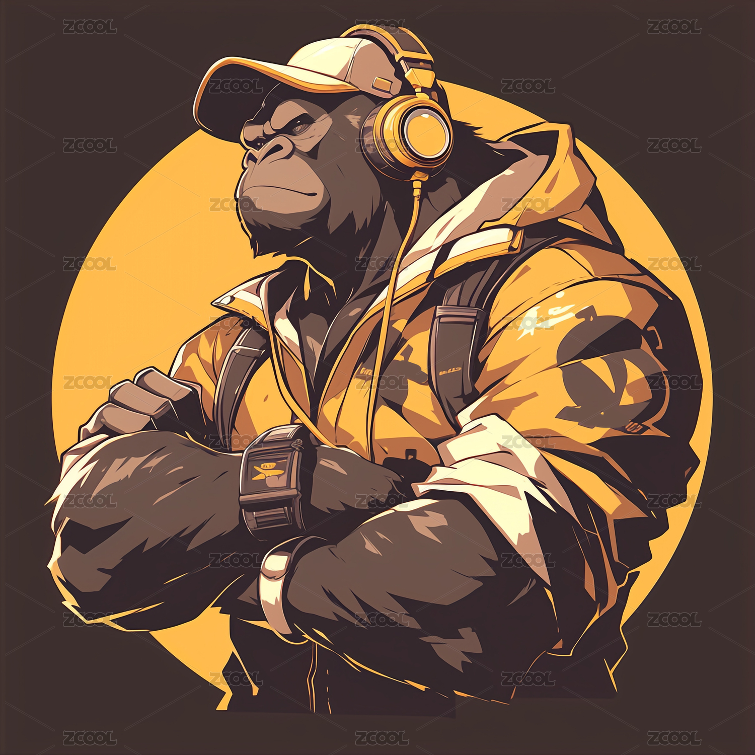 一只强壮的带着耳麦音乐摇滚黑猩猩