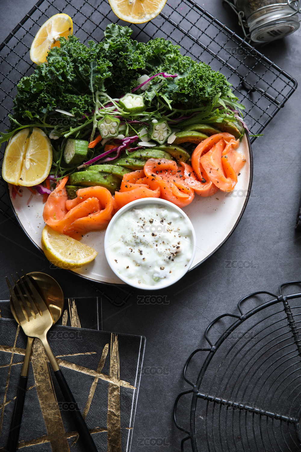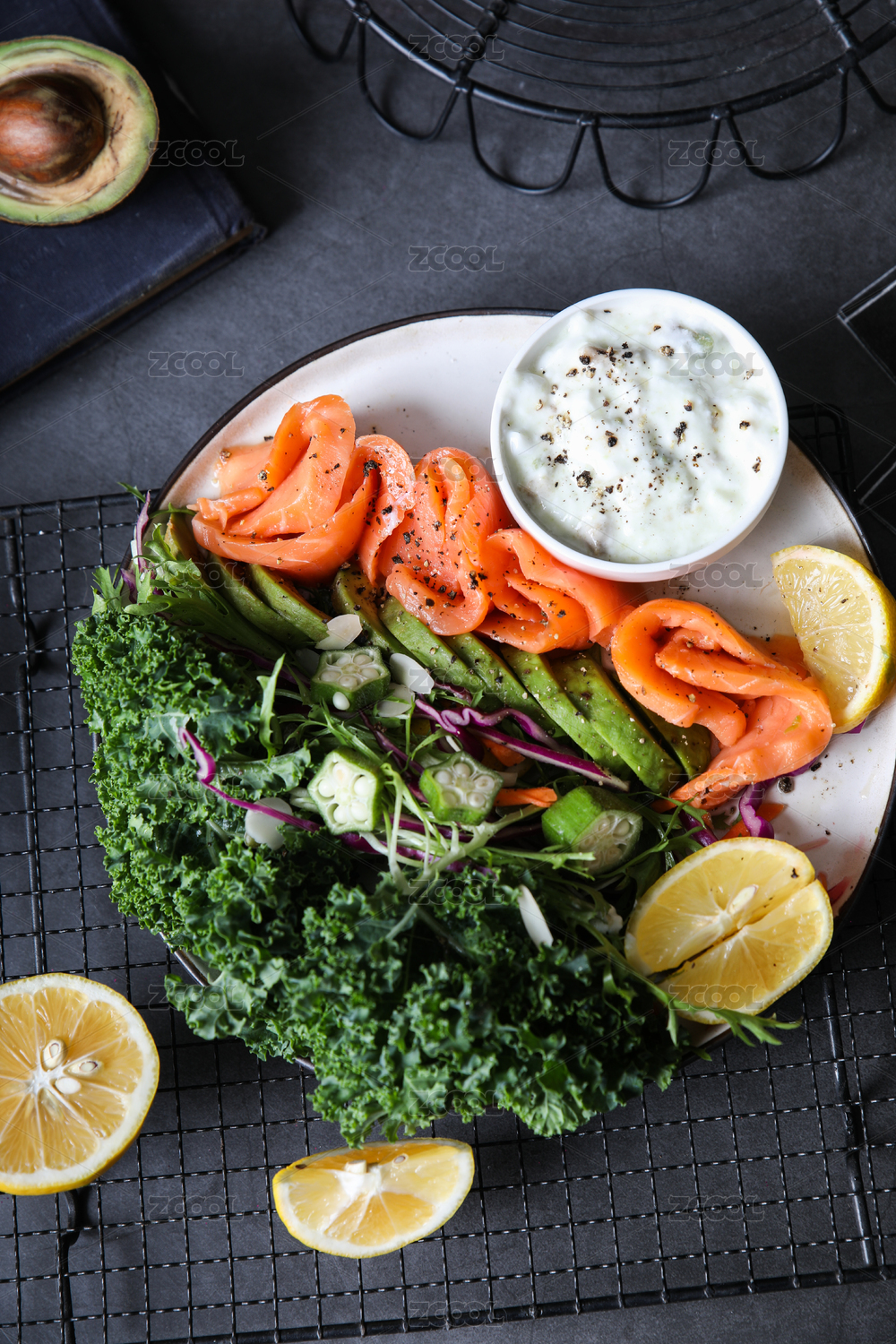 三文鱼,烟熏三文鱼,蔬菜沙拉,柠檬,蔬菜,膳食,食谱,沙拉,烹饪,午餐