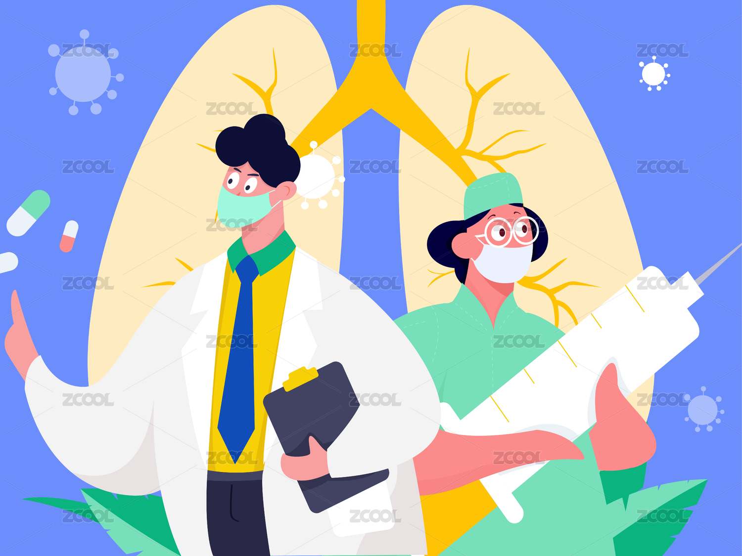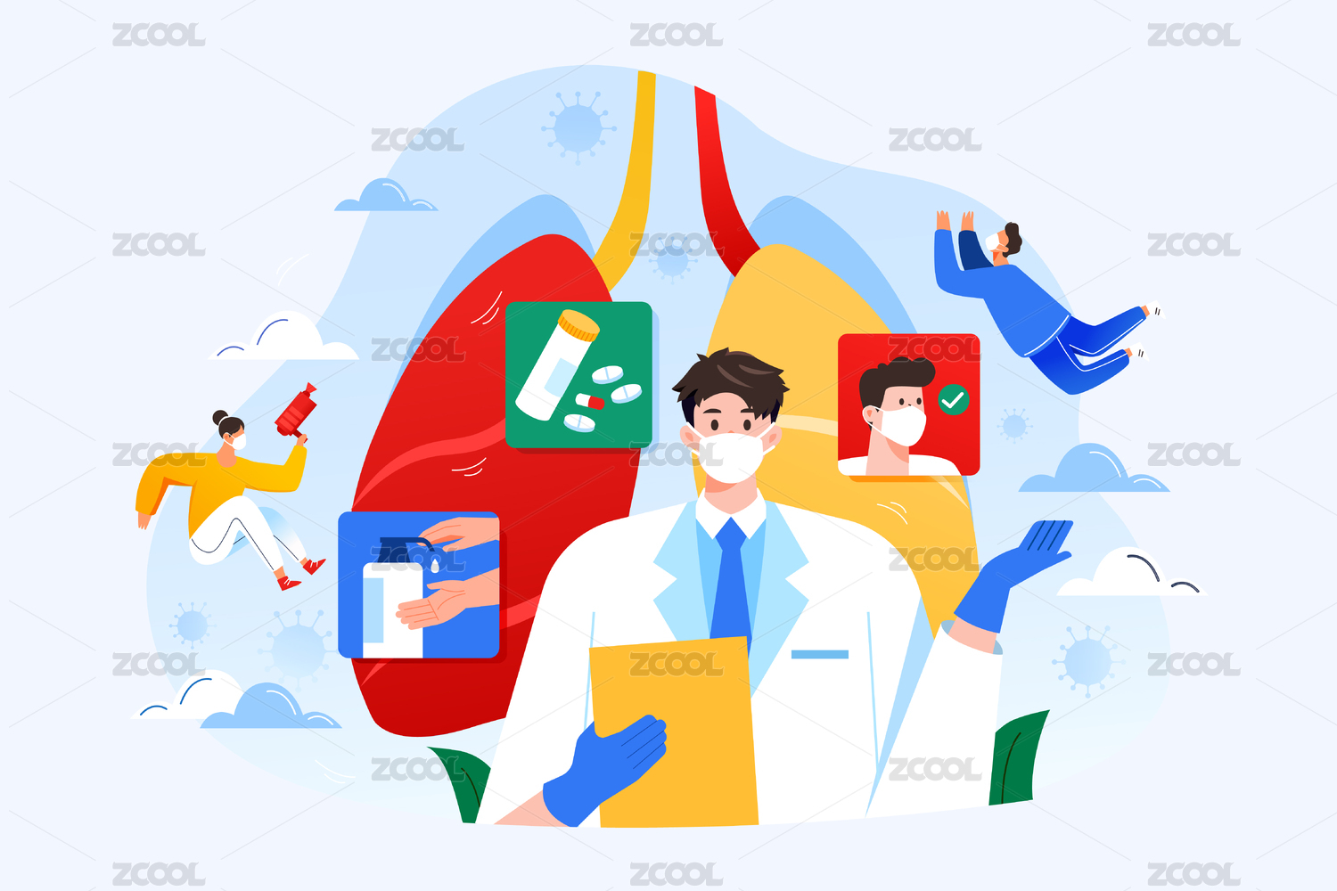 医生讲解肺部知识炫彩科技风插画