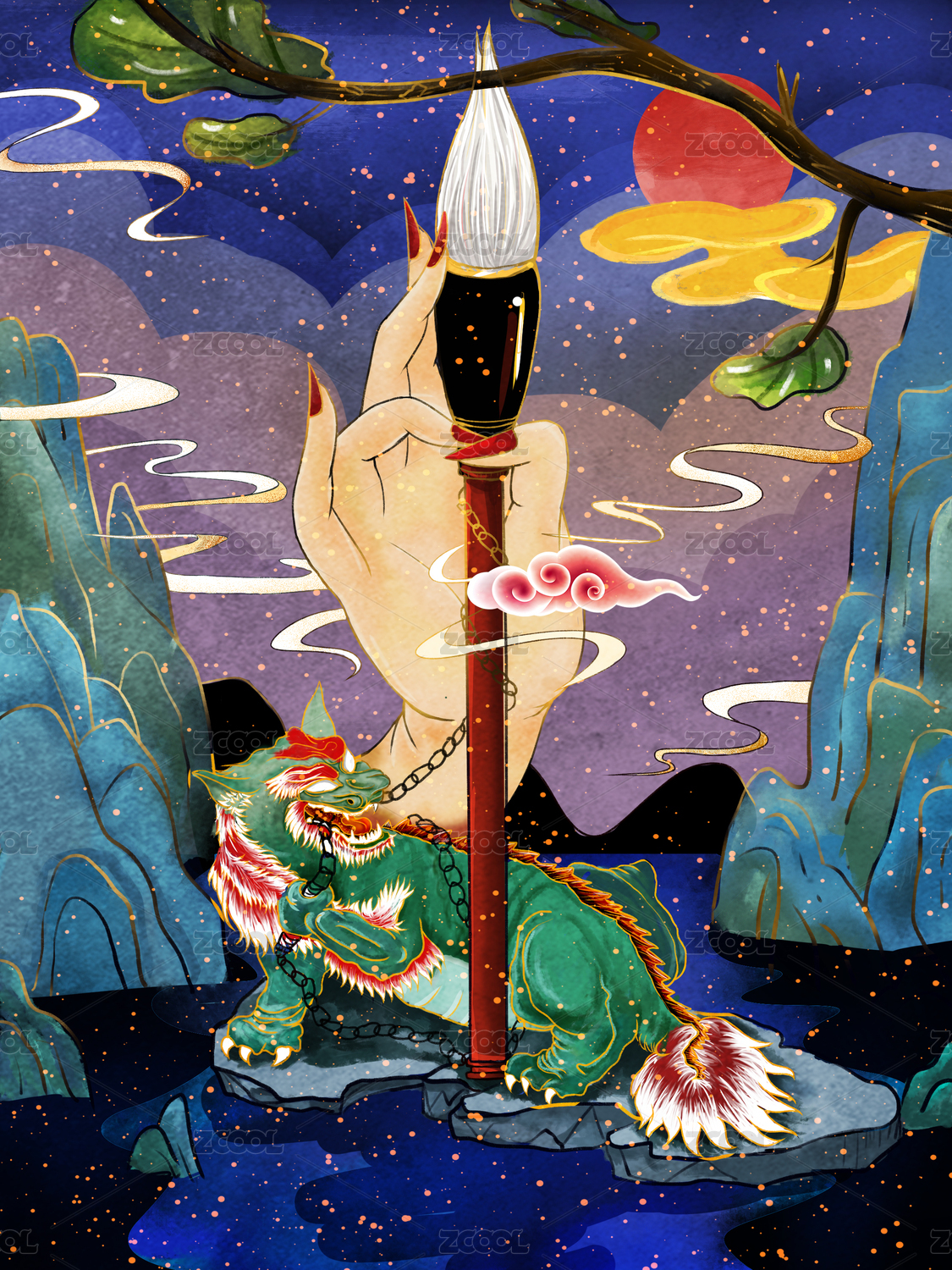 古风神兽年画山水之间