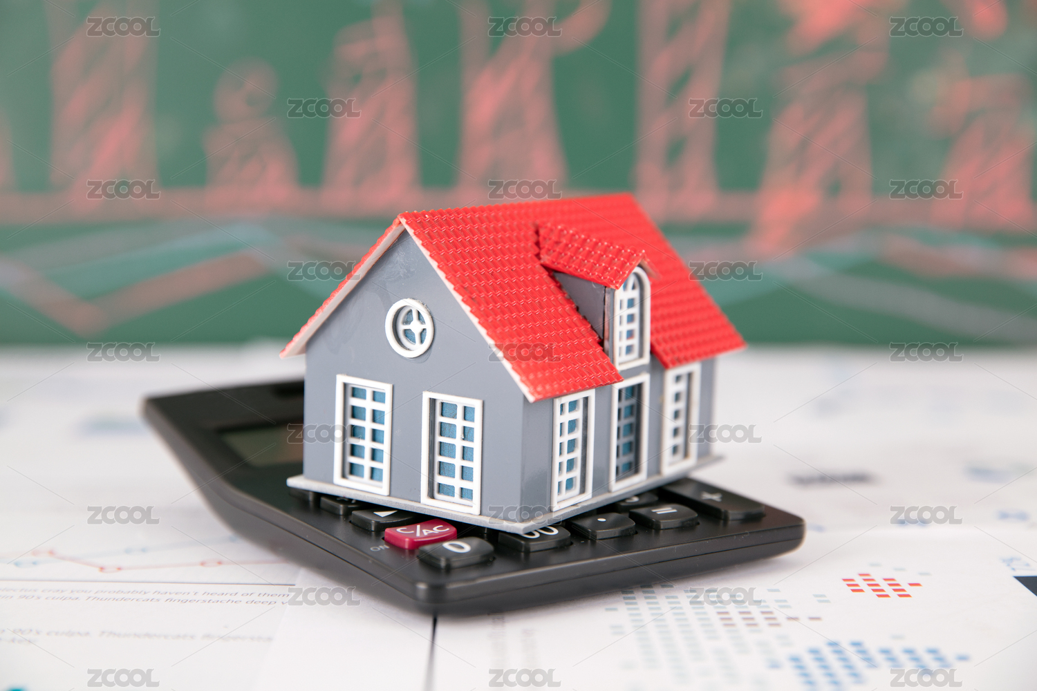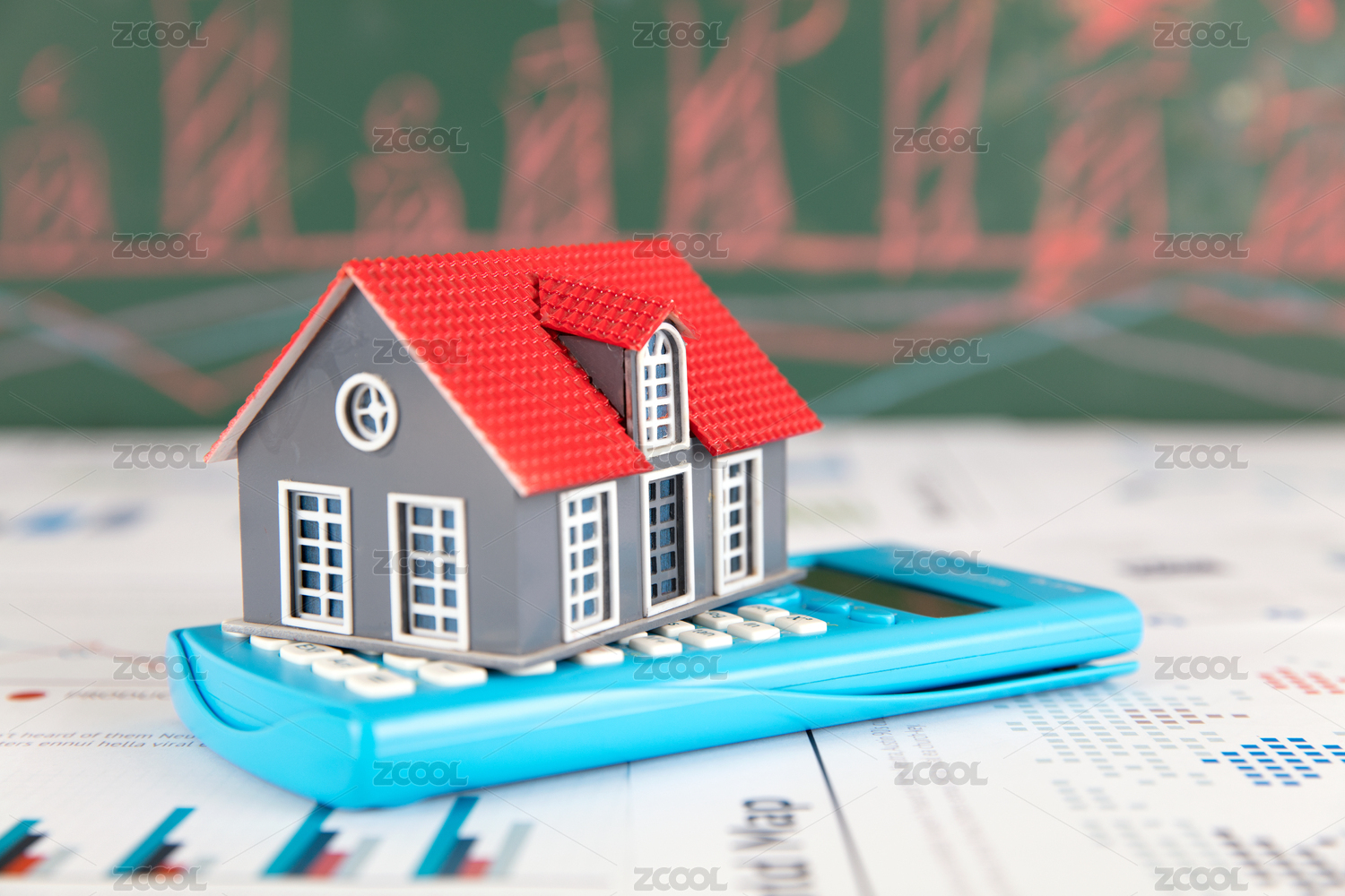 金融图表上的计算器和小房子模型