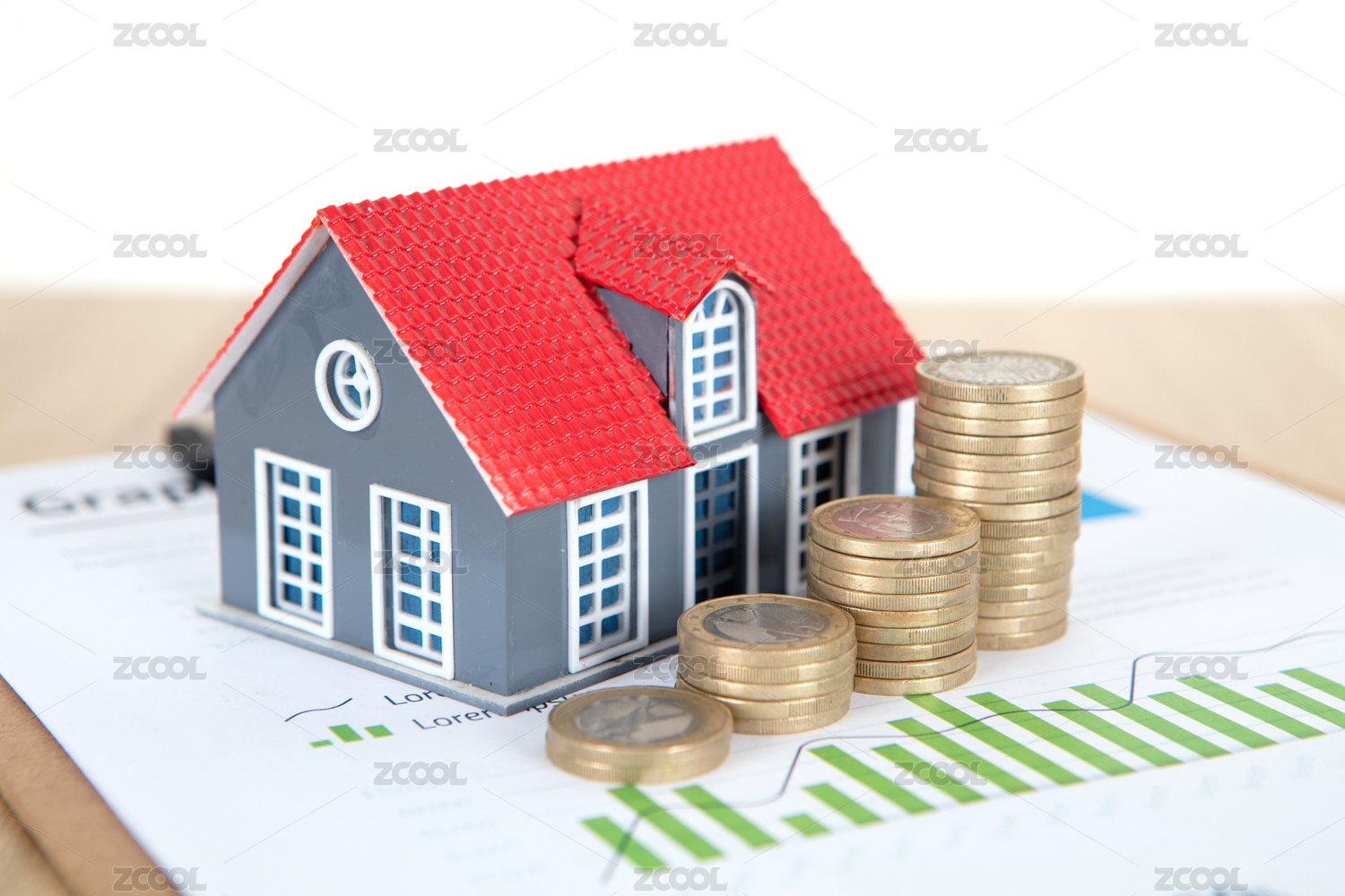 图表文件上的小房子模型和一堆美元硬币