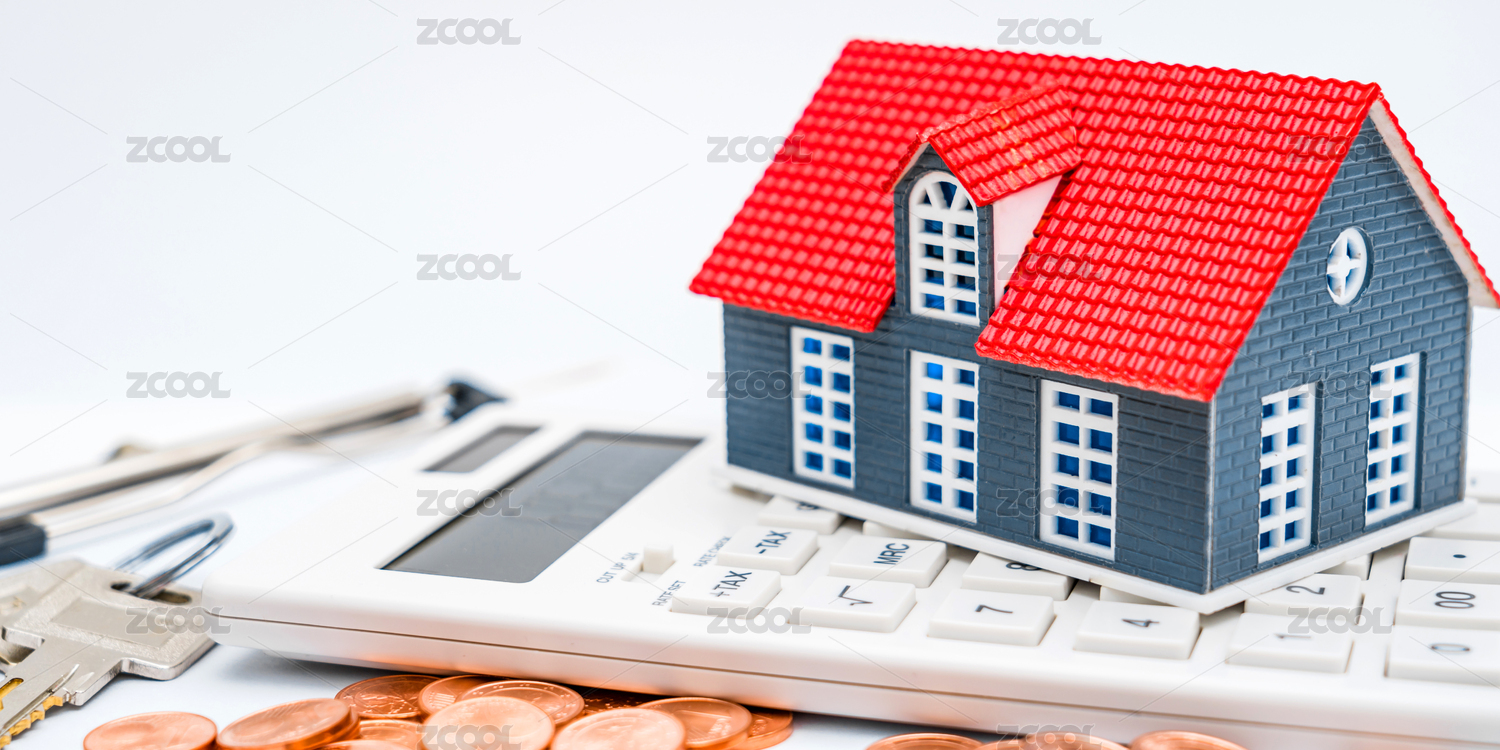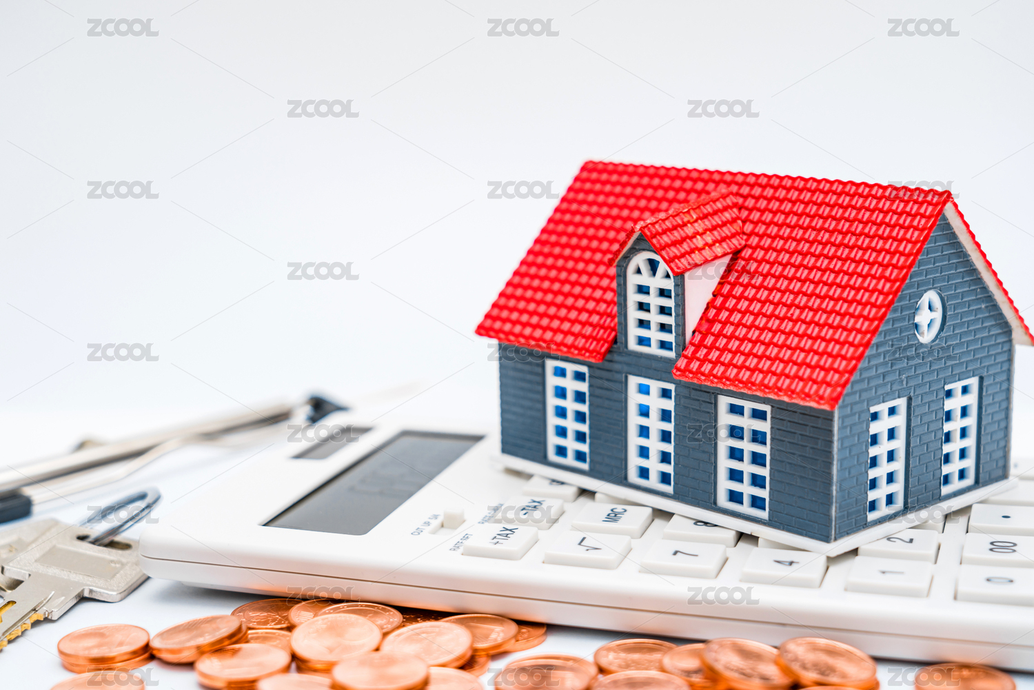 白色背景下的房子模型、计算器、钱币