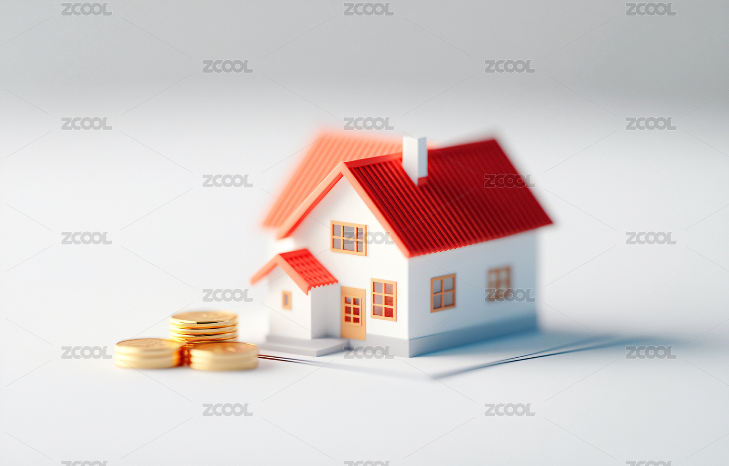 白色背景下的房子模型和金币铺成的小路