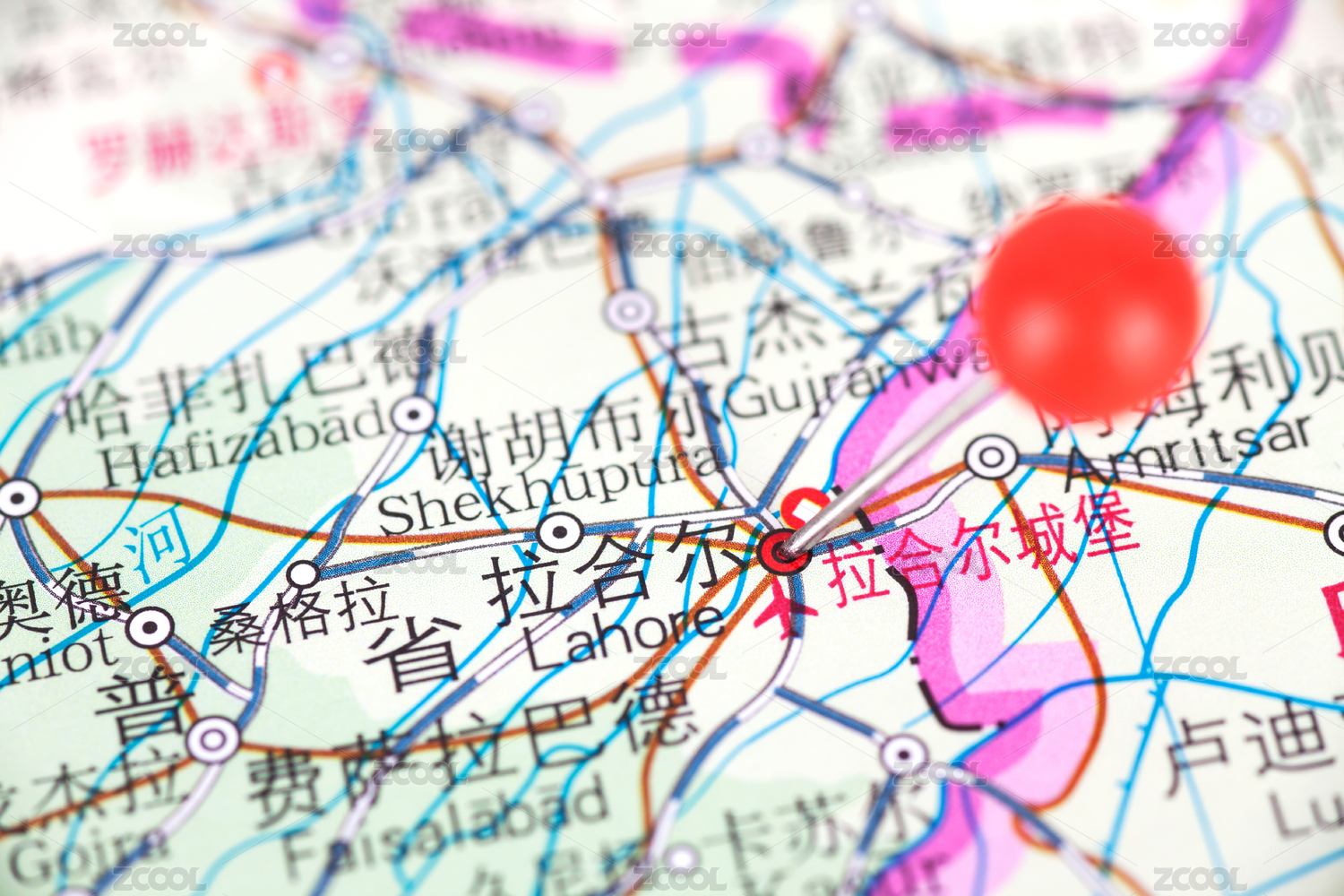 地图上被大头钉标注的巴基斯坦城市拉合尔