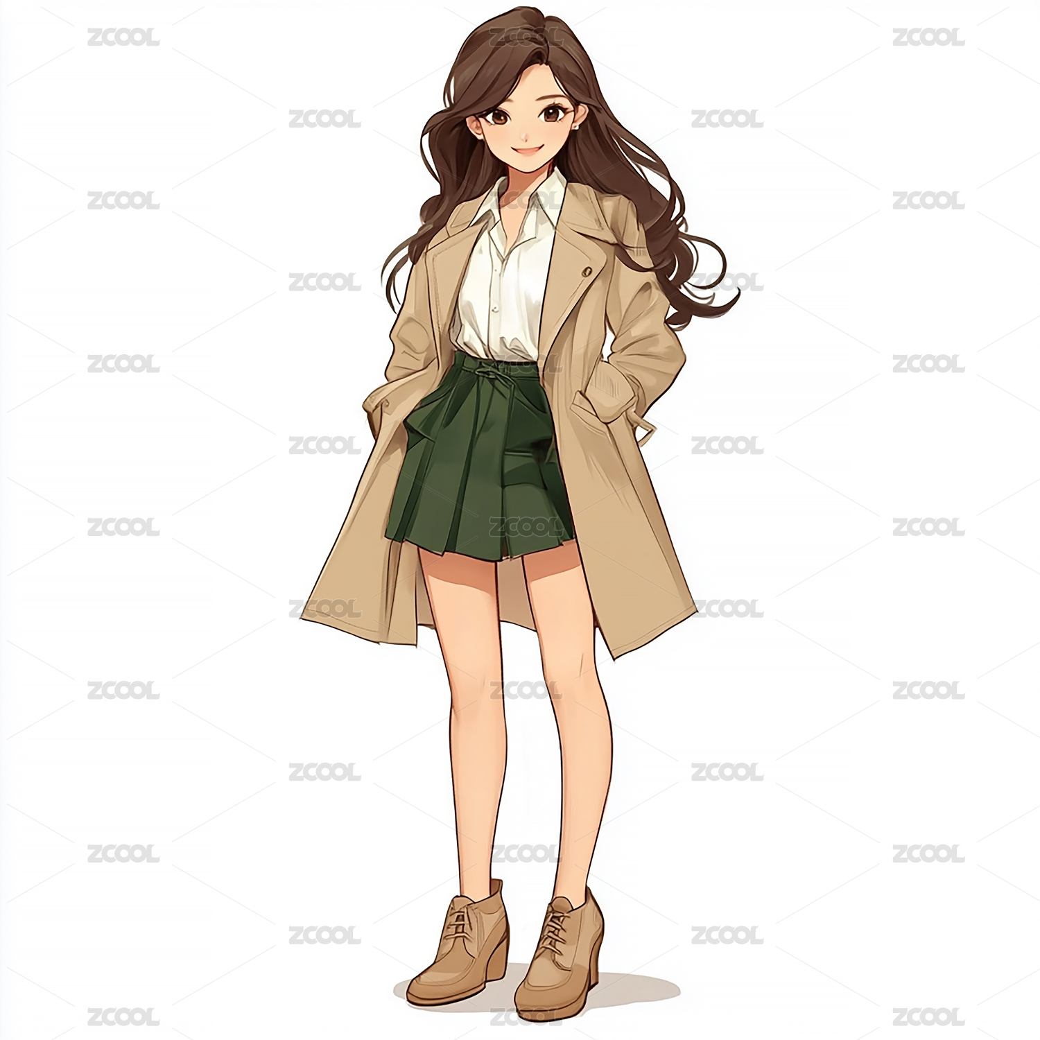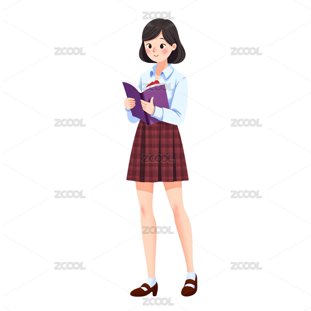 穿着黑色JK制服的长发少女 水彩手绘插画