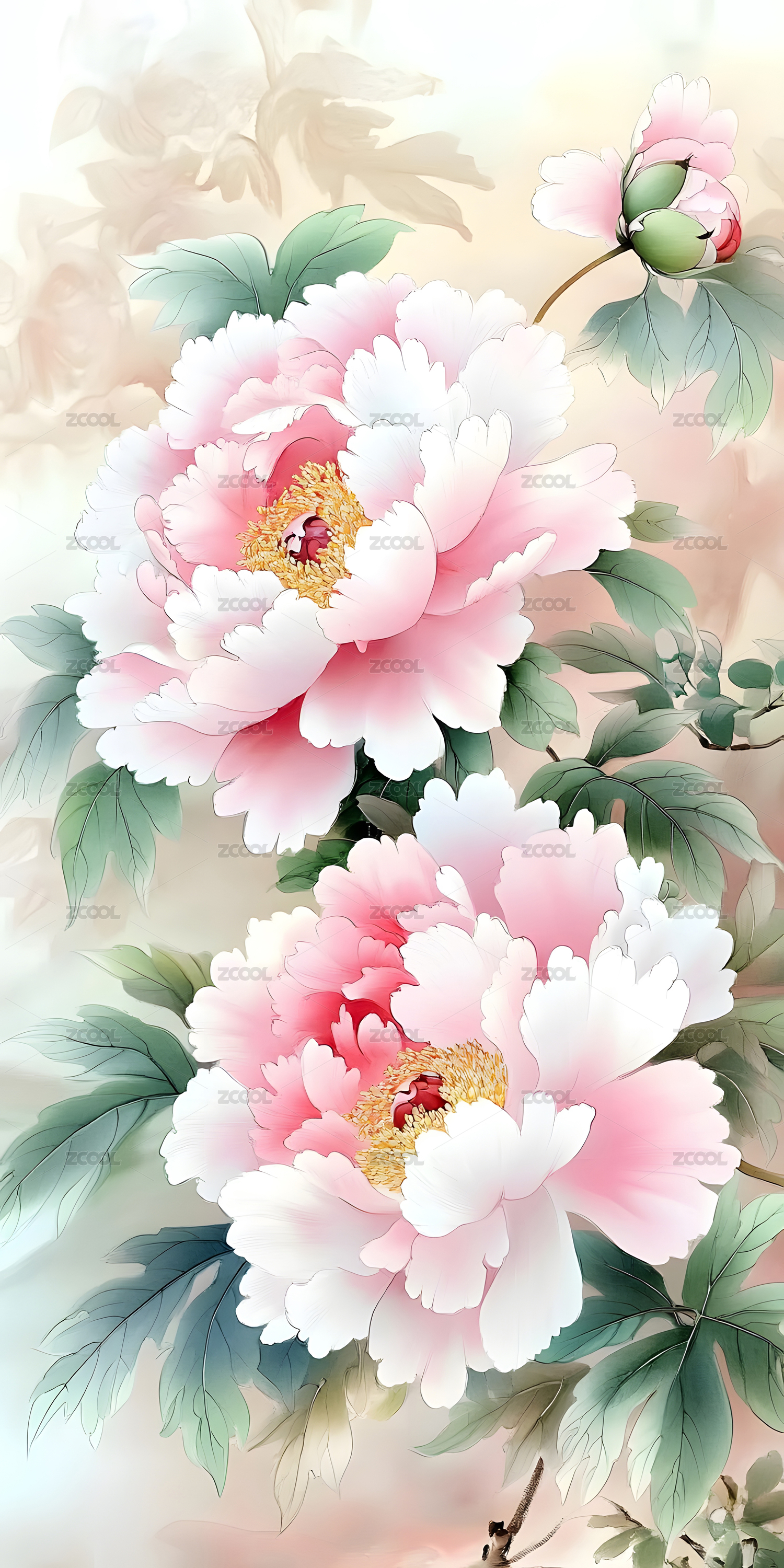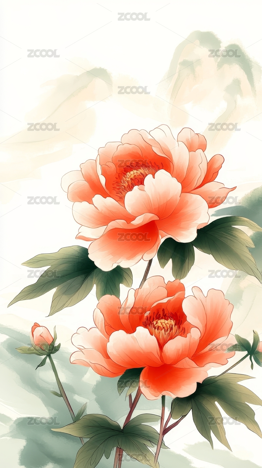 红白牡丹花卉图