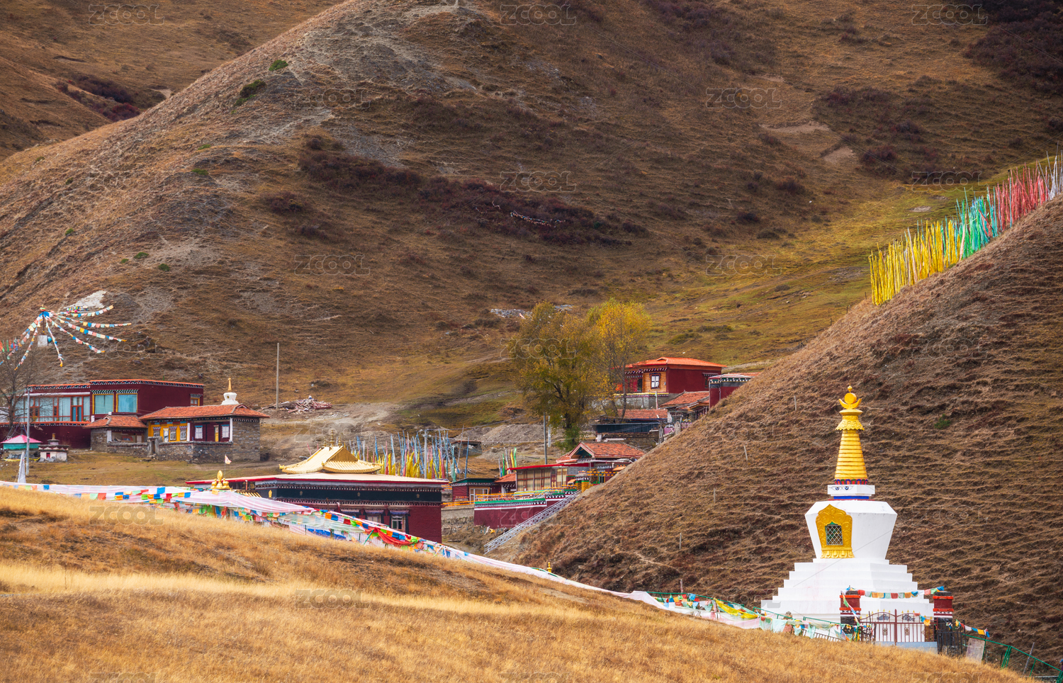 中国四川甘孜康定县山谷里的塔公寺建筑风光