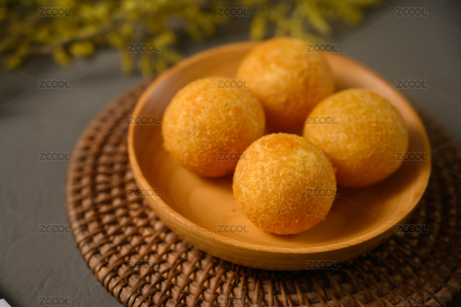 桌面上的盘子里的美味可口的地瓜芝士丸