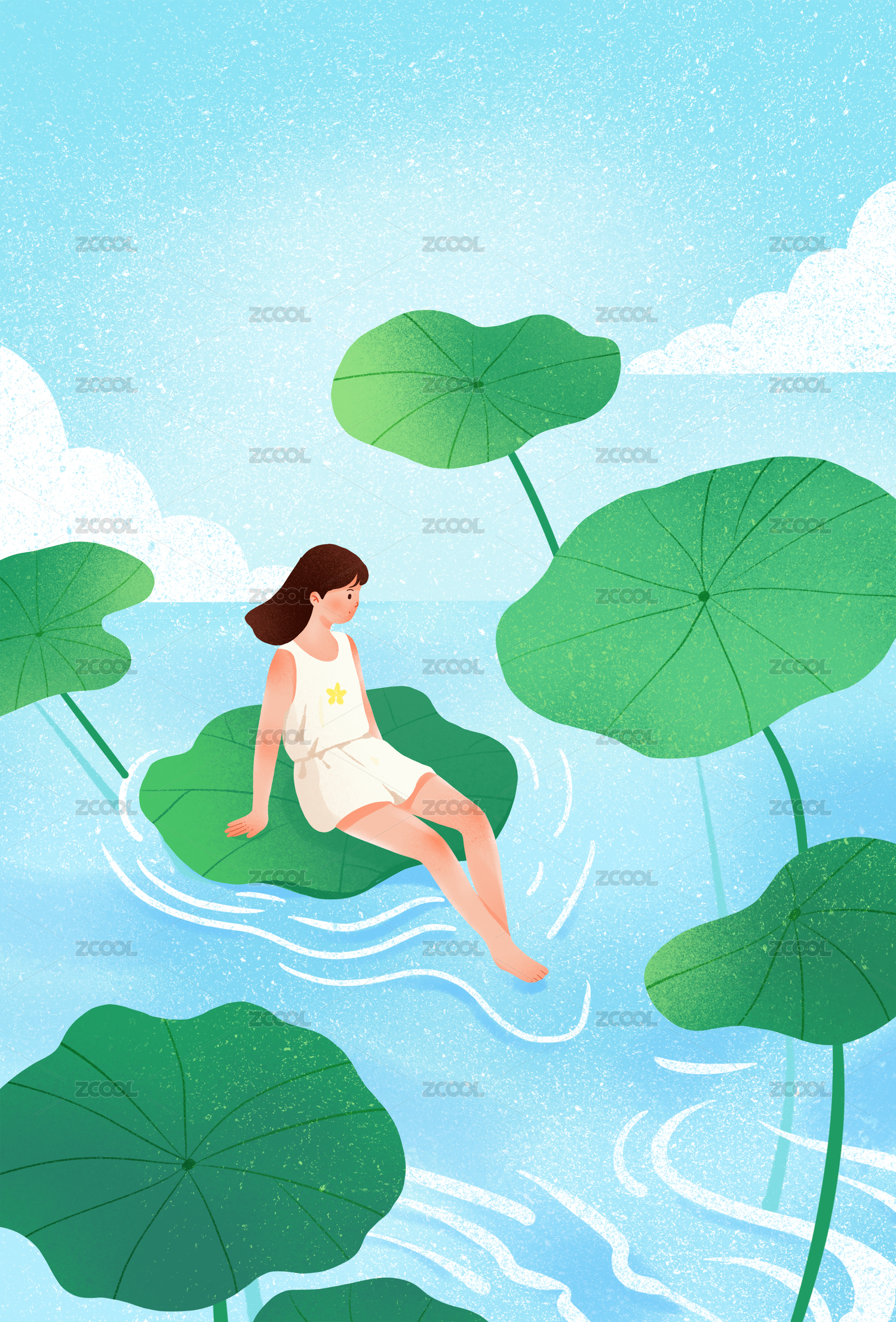 大暑,动漫,荷花,荷叶,可爱,快乐,绿色,女孩,清爽,盛夏