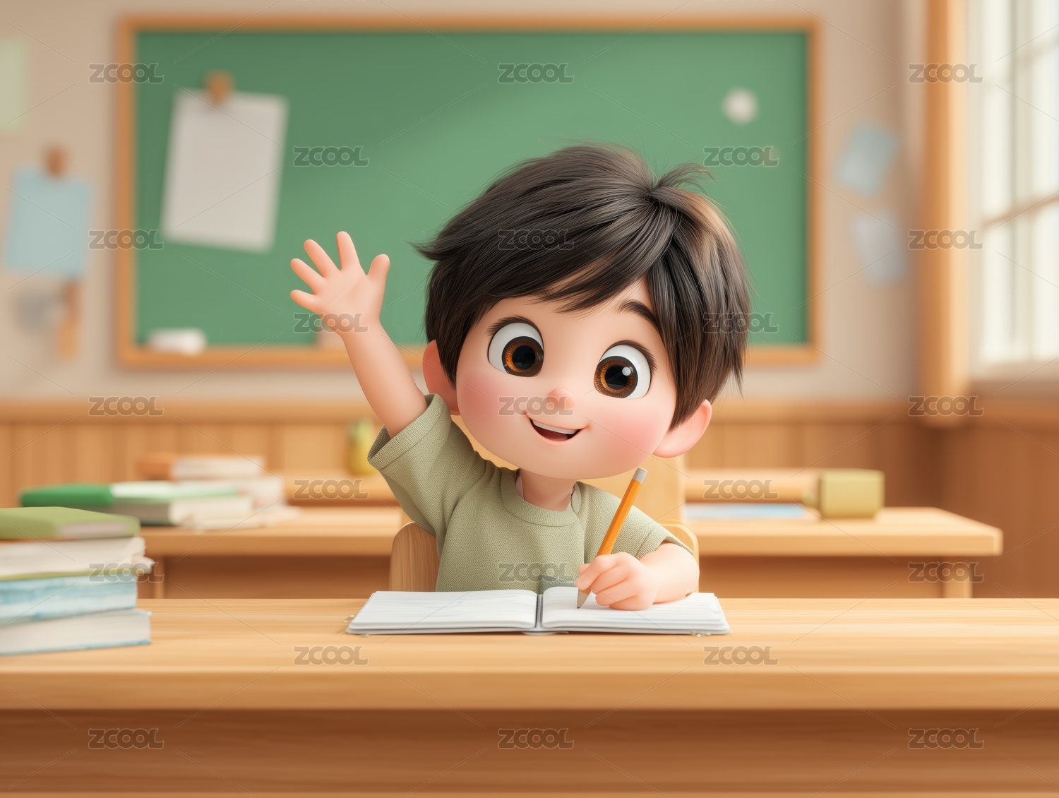 3D卡通风格站在教室里拿着书本微笑的儿童