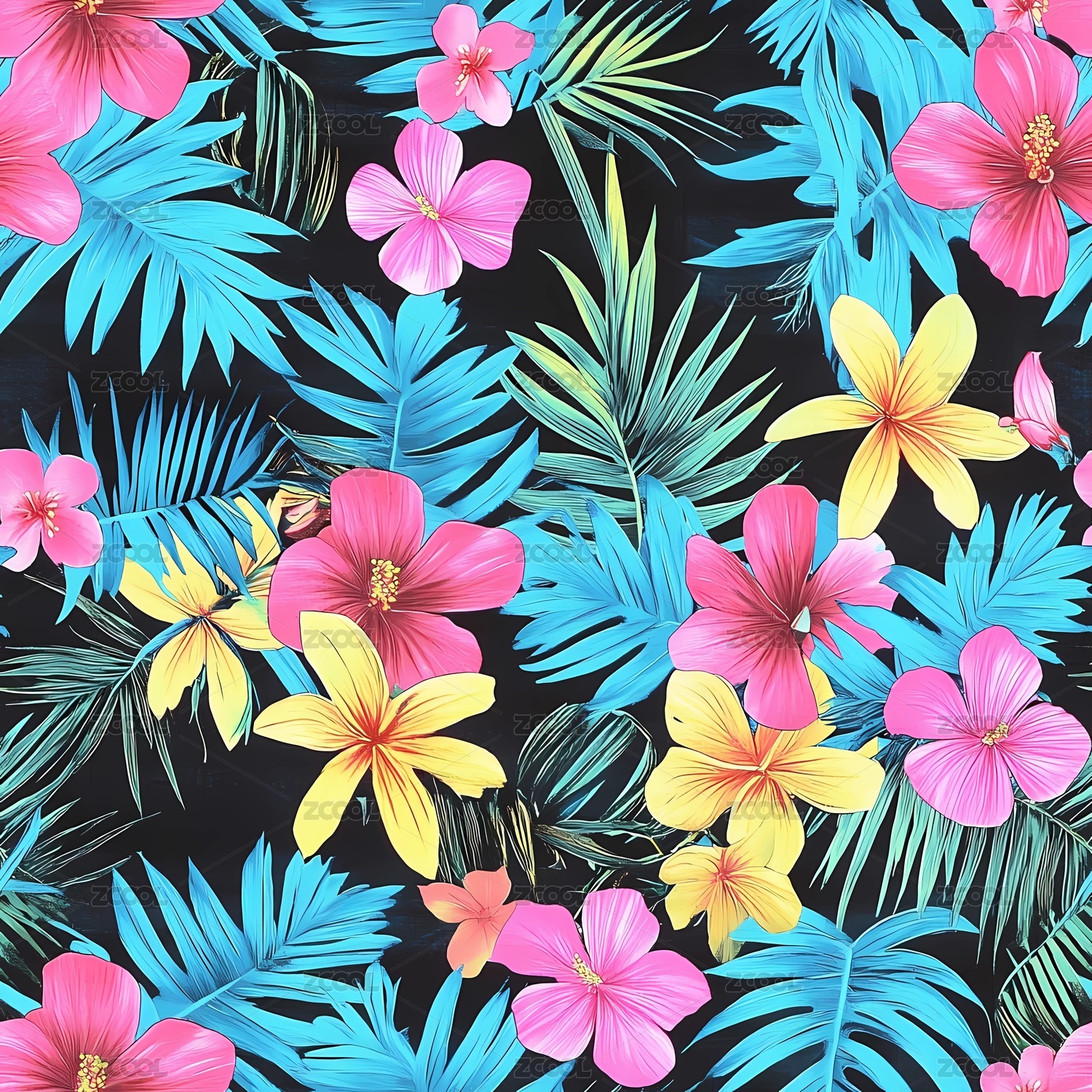 热带叶子,花朵,热带花朵,无缝,黑色背景