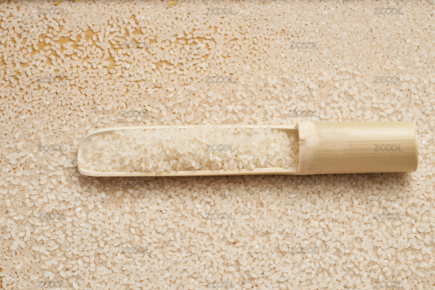 大量的白色颗粒大米在桌上摆放着金黄色作物