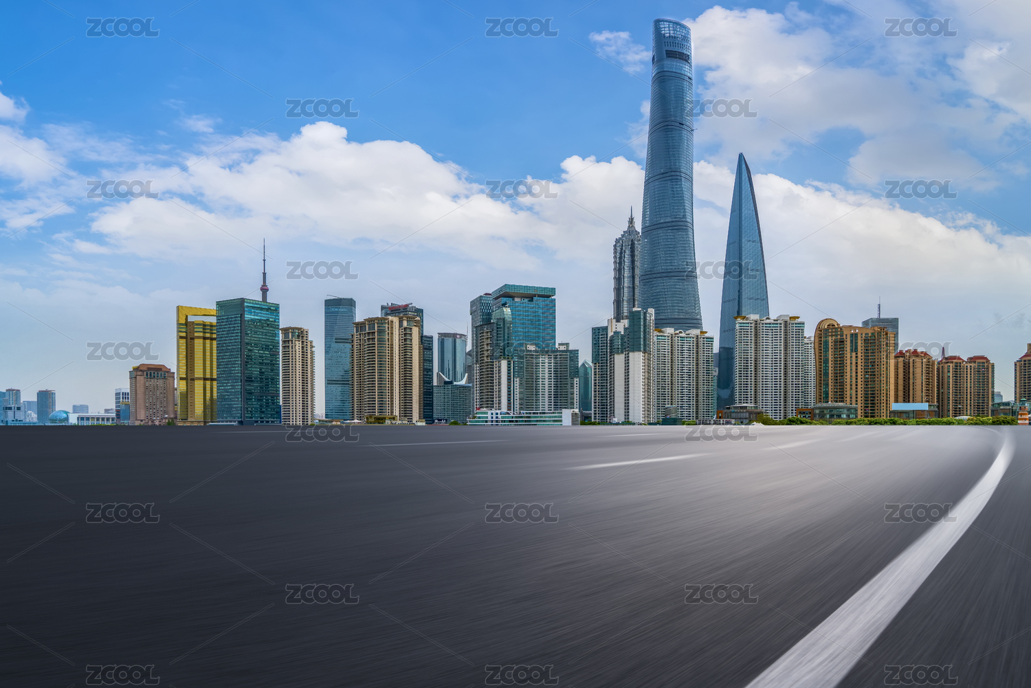 沥青高速公路天际线和上海陆家嘴金融区建筑景观