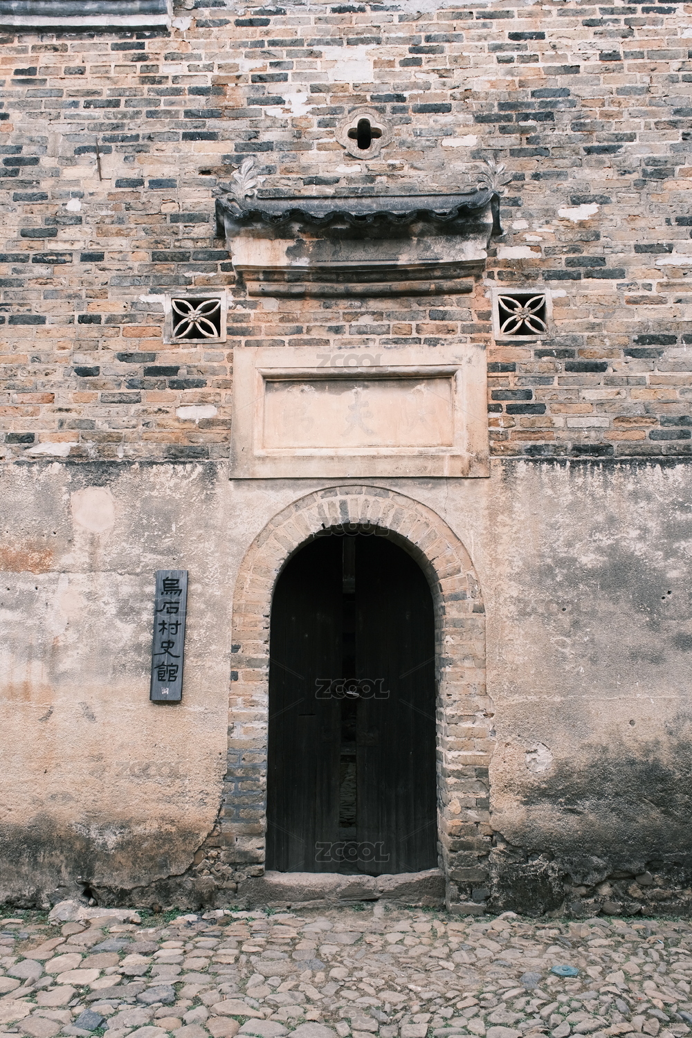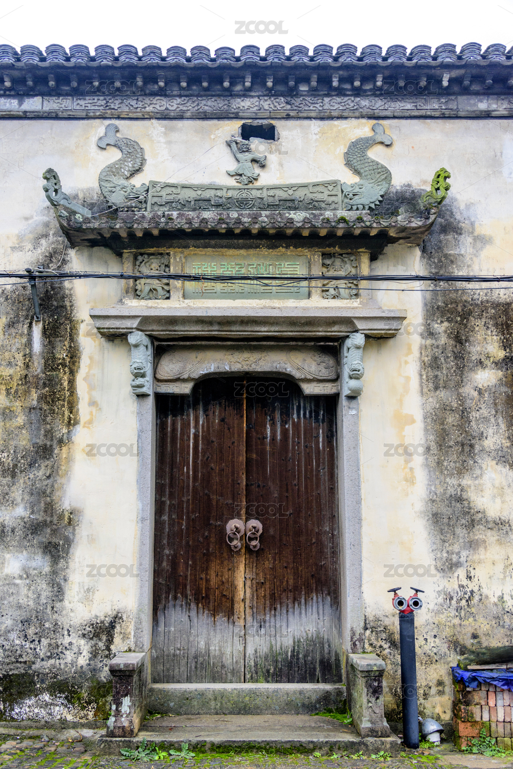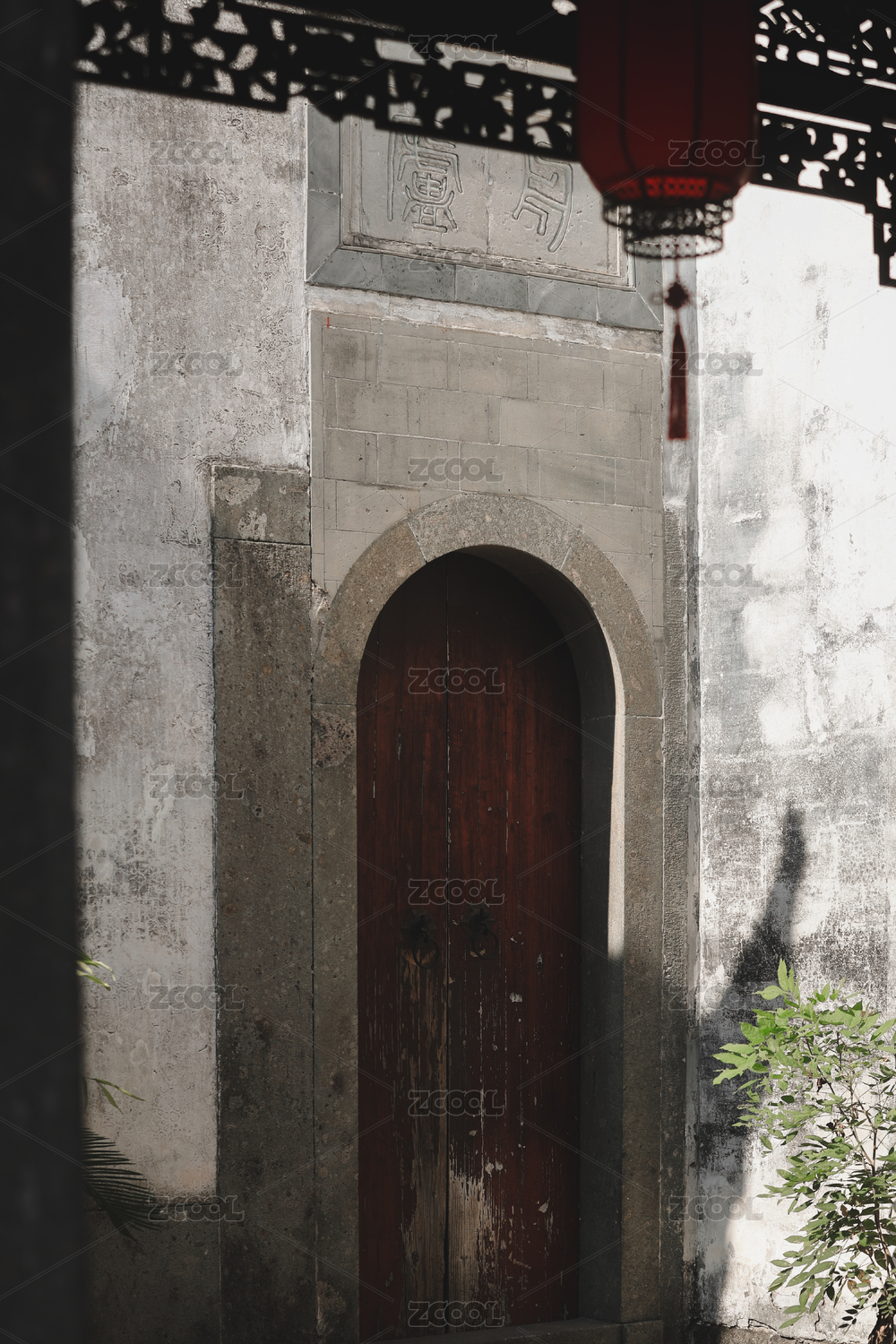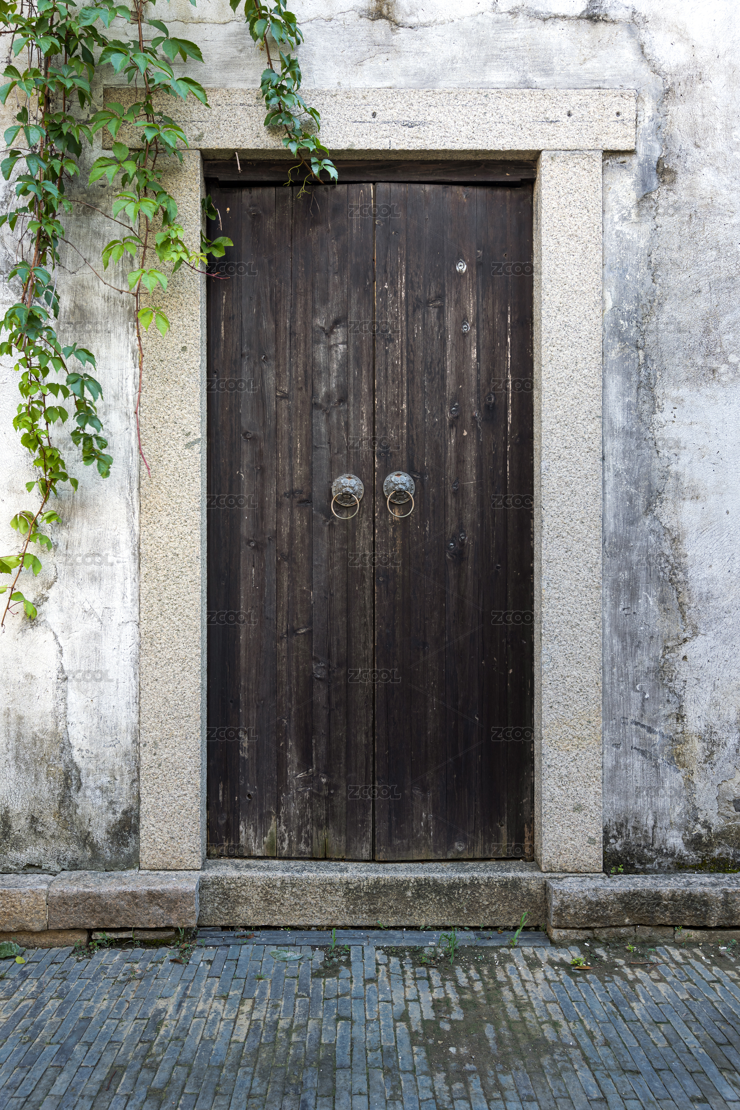 绿色植物在安徽,中国的古村落传统房屋的木门。