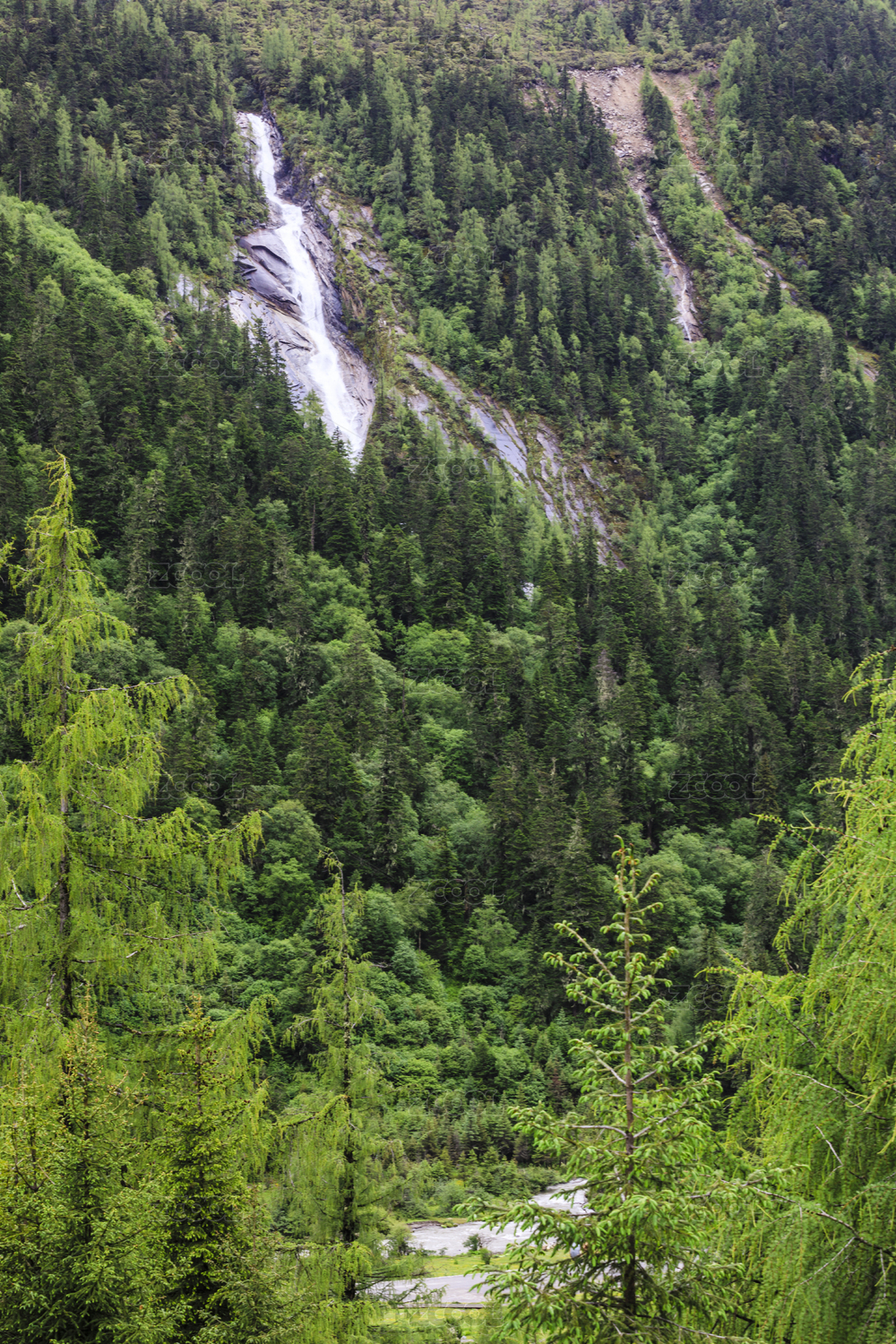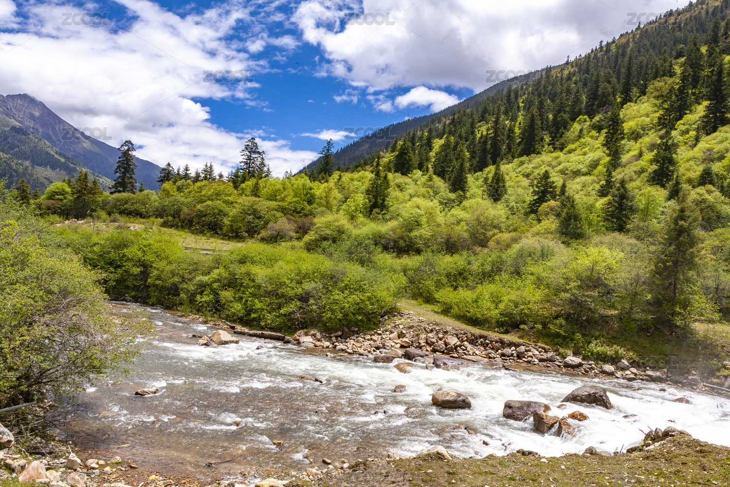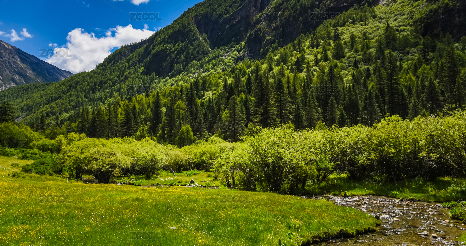 四川阿坝黑水县达古冰川的河流和原始森林