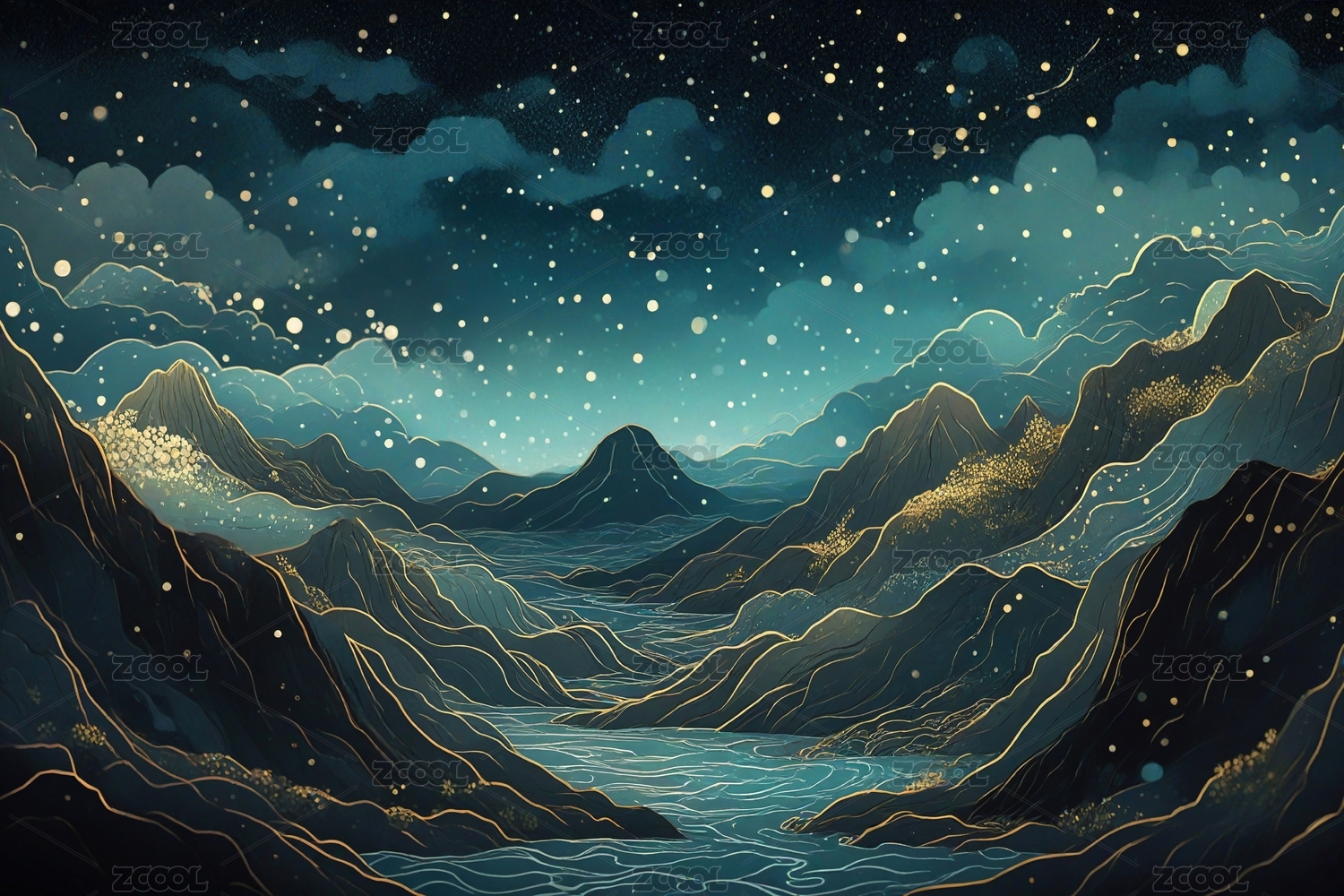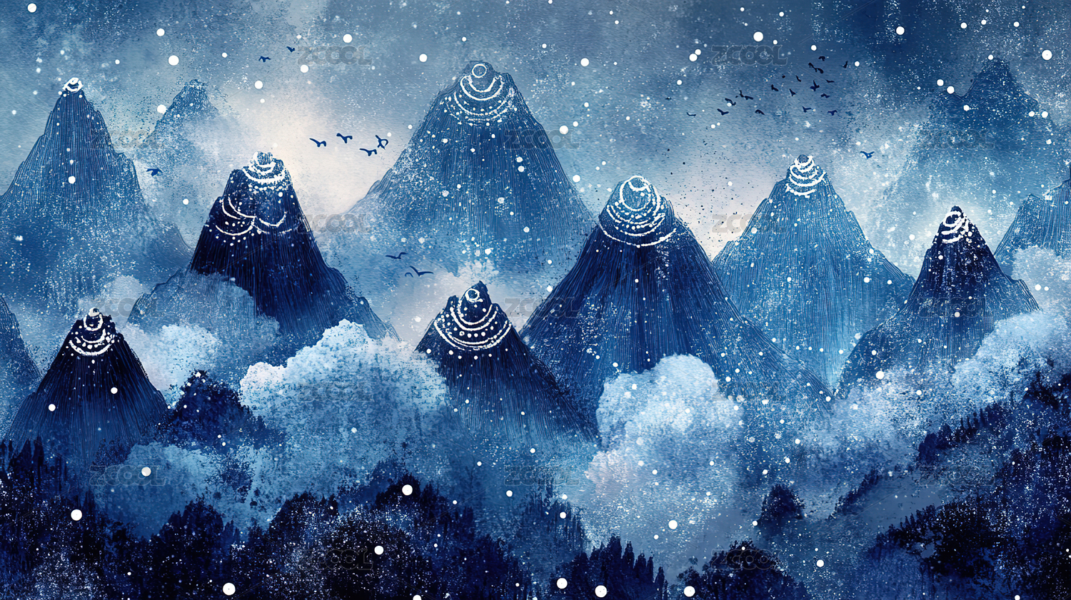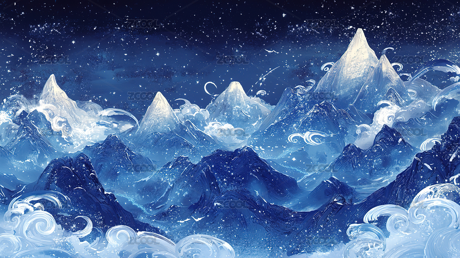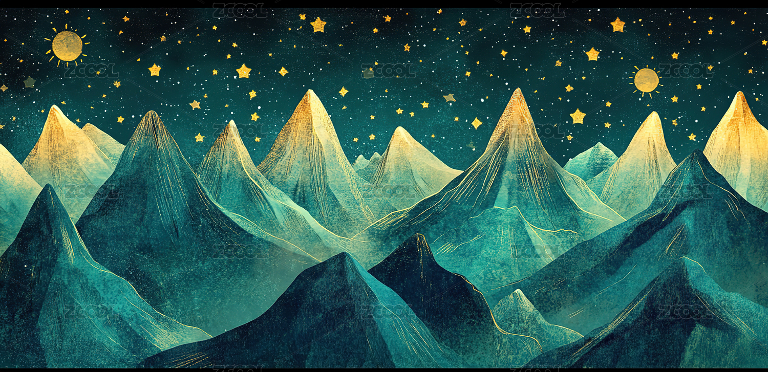 水彩风格雪山星空图