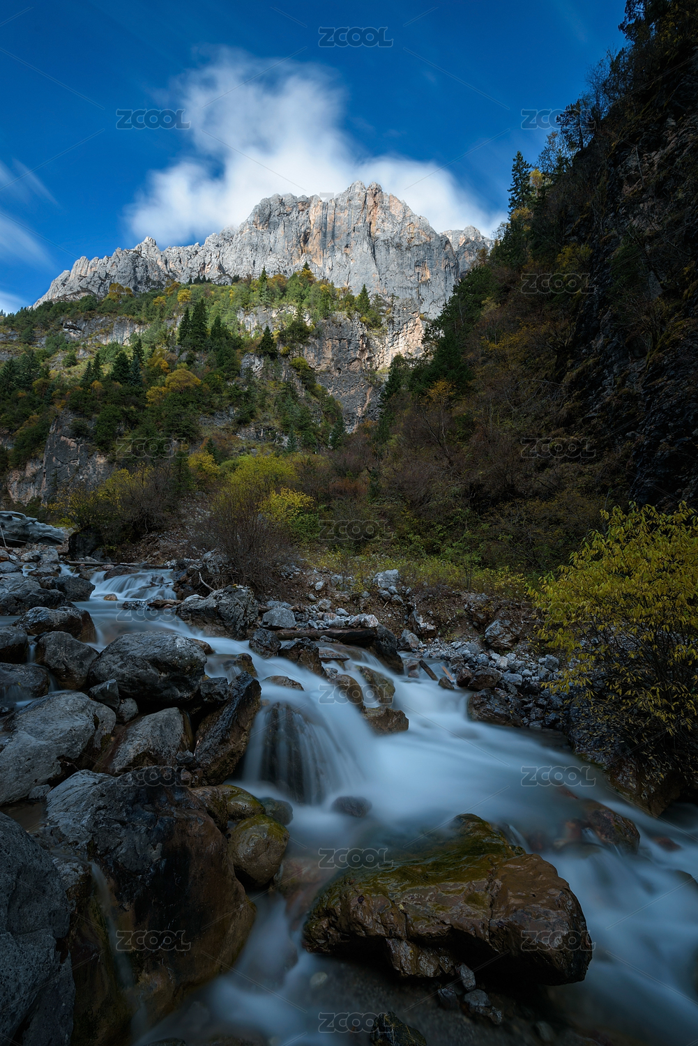四姑娘山长坪沟原始森林里的参天大树和溪流
