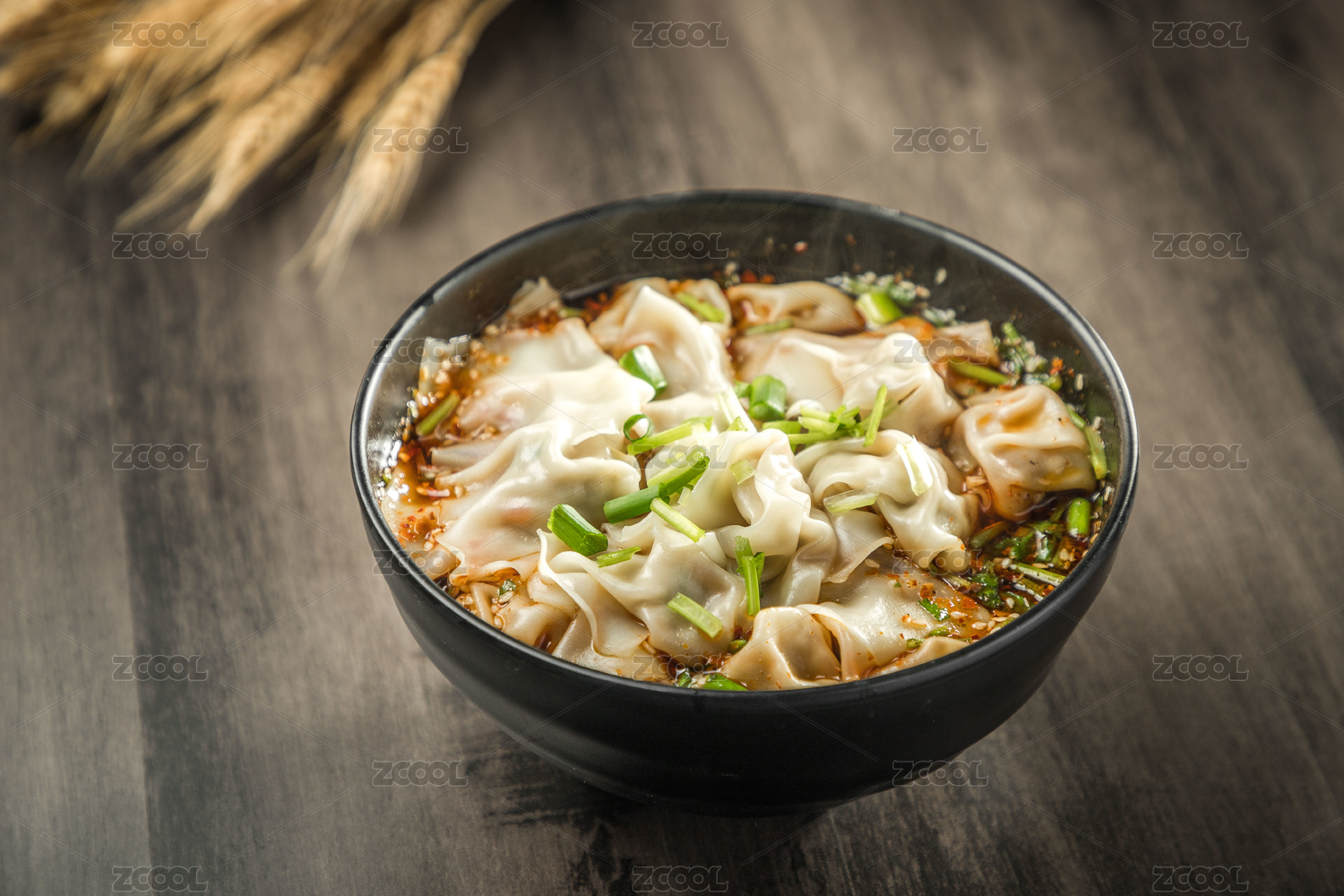 木板背景上满满一盘美味馄饨