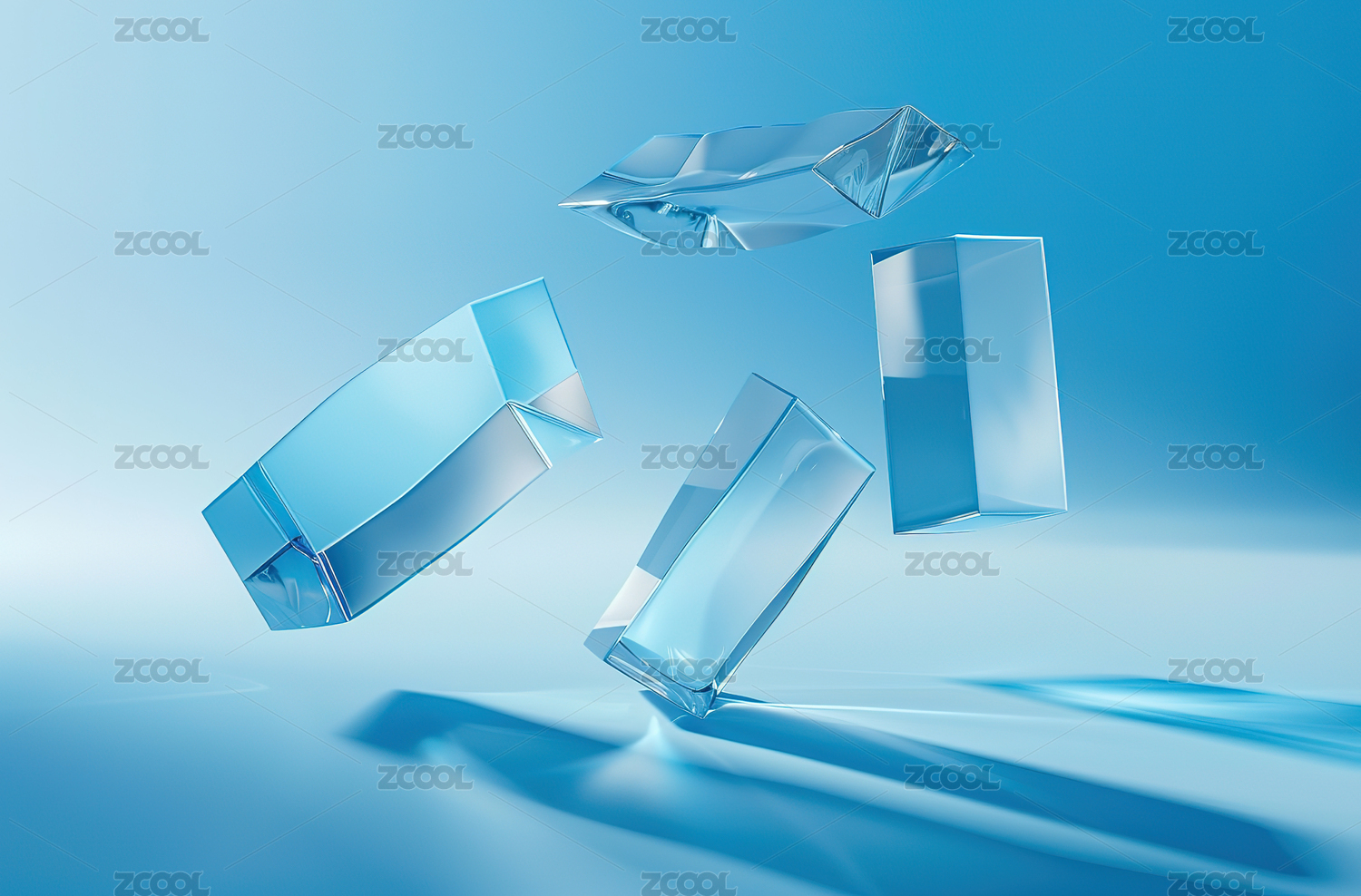 抛起的透明清澈正方体冰块蓝色背景素材