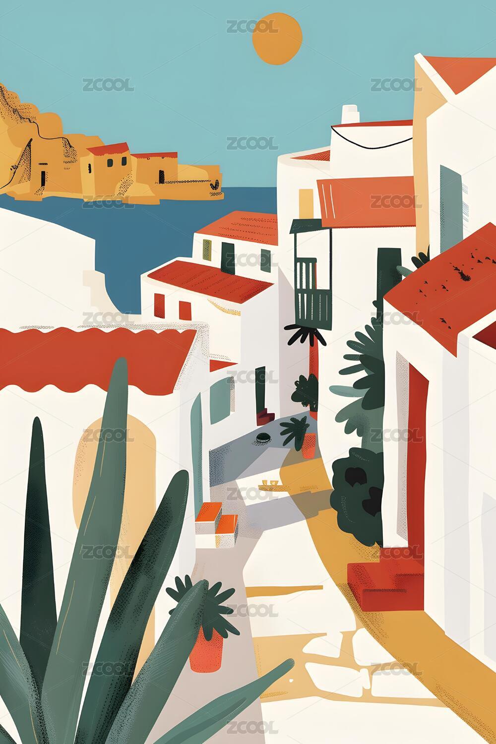 地中海彩色村庄插画