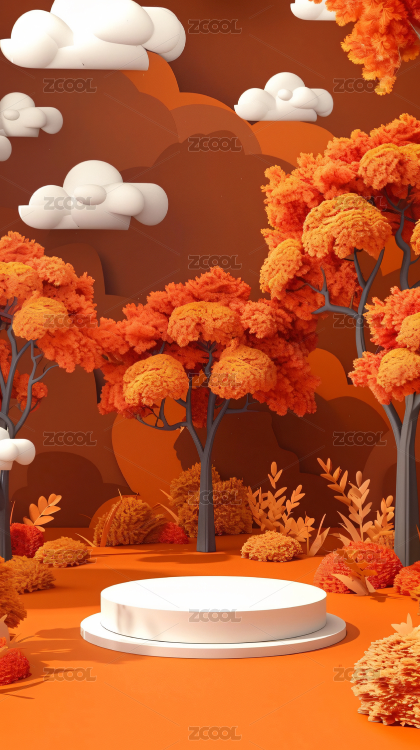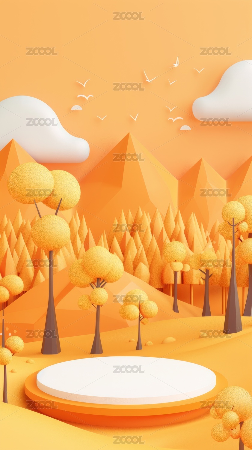 产品展台背景:3D橙色森林树木产品展台背